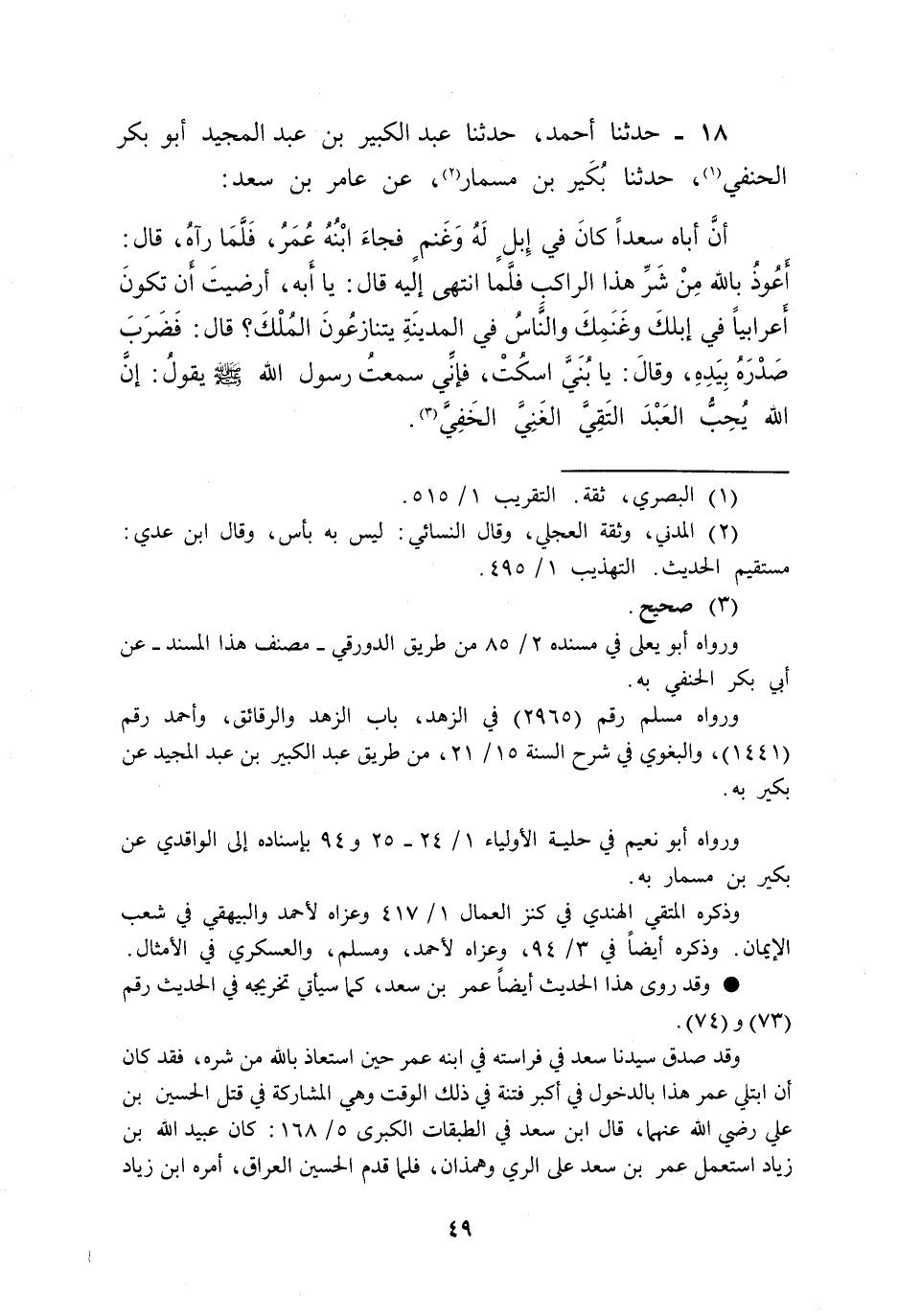 18 - حَدَّثَنَا أَحْمَدُ، حَدَّثَنَا عَبْدُ الْكَبِيرِ بْنُ عَبْدِ الْمَجِيدِ أَبُو بَكْرٍ الْحَنَفِيُّ , حَدَّثَنَا بُكَيْرُ بْنُ مِسْمَارٍ , عَنْ عَامِرِ بْنِ سَعْدٍ أَنَّ أَبَاهُ سَعْدًا كَانَ فِي إِبِلٍ لَهُ وَغَنَمٍ فَجَاءَ ابْنُهُ عُمَرُ فَلَمَّا رَآهُ قَالَ: أَعُوذُ بِاللَّهِ مِنْ شَرِّ هَذَا الرَّاكِبِ فَلَمَّا انْتَهَى إِلَيْهِ قَالَ: يَا أَبَهْ، أَرَضِيتَ أَنْ تَكُونَ أَعْرَابِيًّا فِي إِبِلِكَ وَغَنَمِكَ وَالنَّاسُ فِي الْمَدِينَةِ يَتَنَازَعُونَ الْمُلْكَ؟ قَالَ: فَضَرَبَ صَدْرَهُ بِيَدِهِ وَقَالَ: يَا بُنَيَّ، اسْكُتْ فَإِنِّي سَمِعْتُ رَسُولَ اللَّهِ صَلَّى اللهُ عَلَيْهِ وَسَلَّمَ يَقُولُ: «§إِنَّ اللَّهَ يُحِبُّ الْعَبْدَ التَّقِيَّ الْغَنِيَّ الْخَفِيَّ»