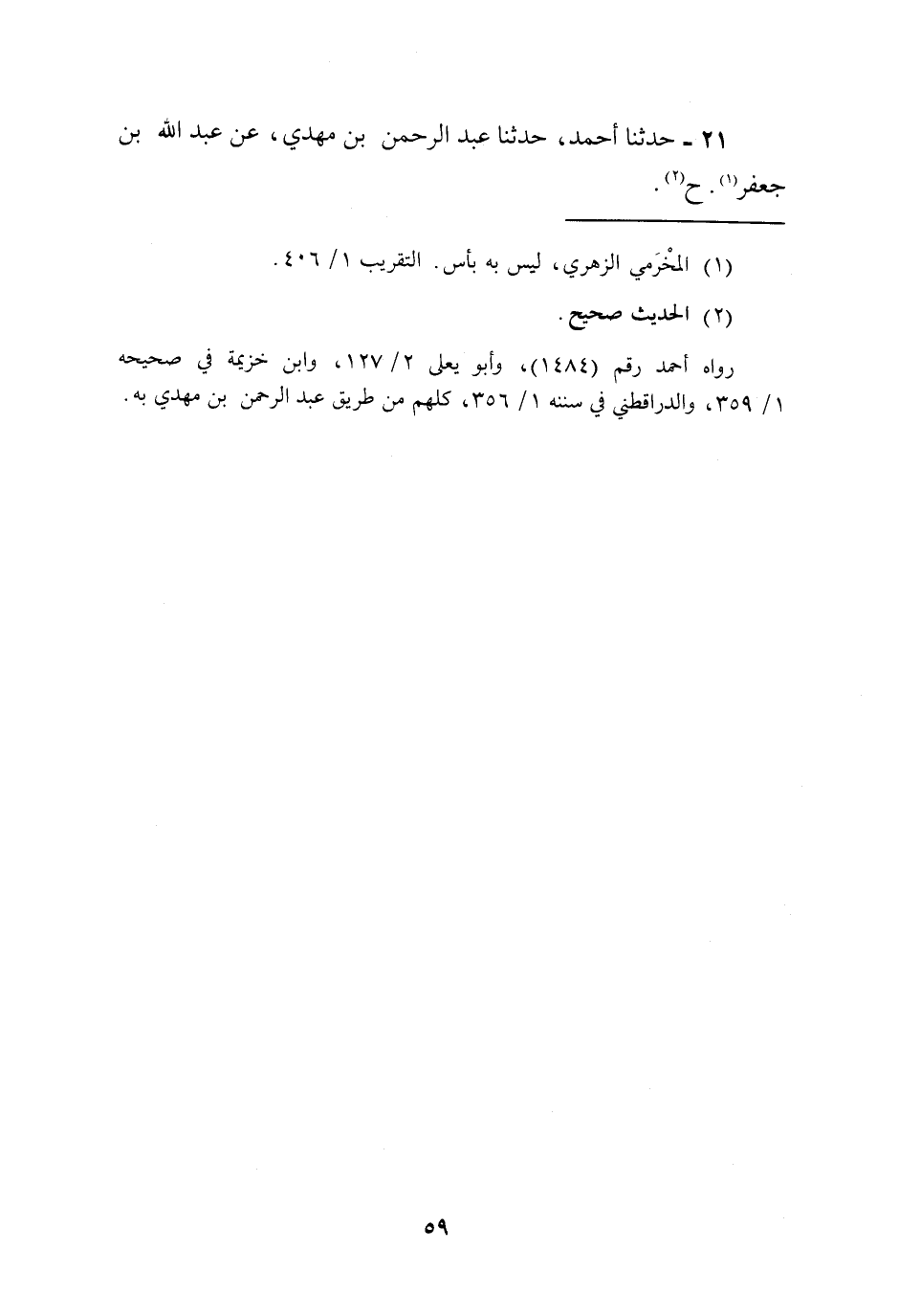 21 - حَدَّثَنَا أَحْمَدُ، حَدَّثَنَا عَبْدُ الرَّحْمَنِ بْنُ مَهْدِيٍّ , عَنْ عَبْدِ اللَّهِ بْنِ جَعْفَرٍ. ح