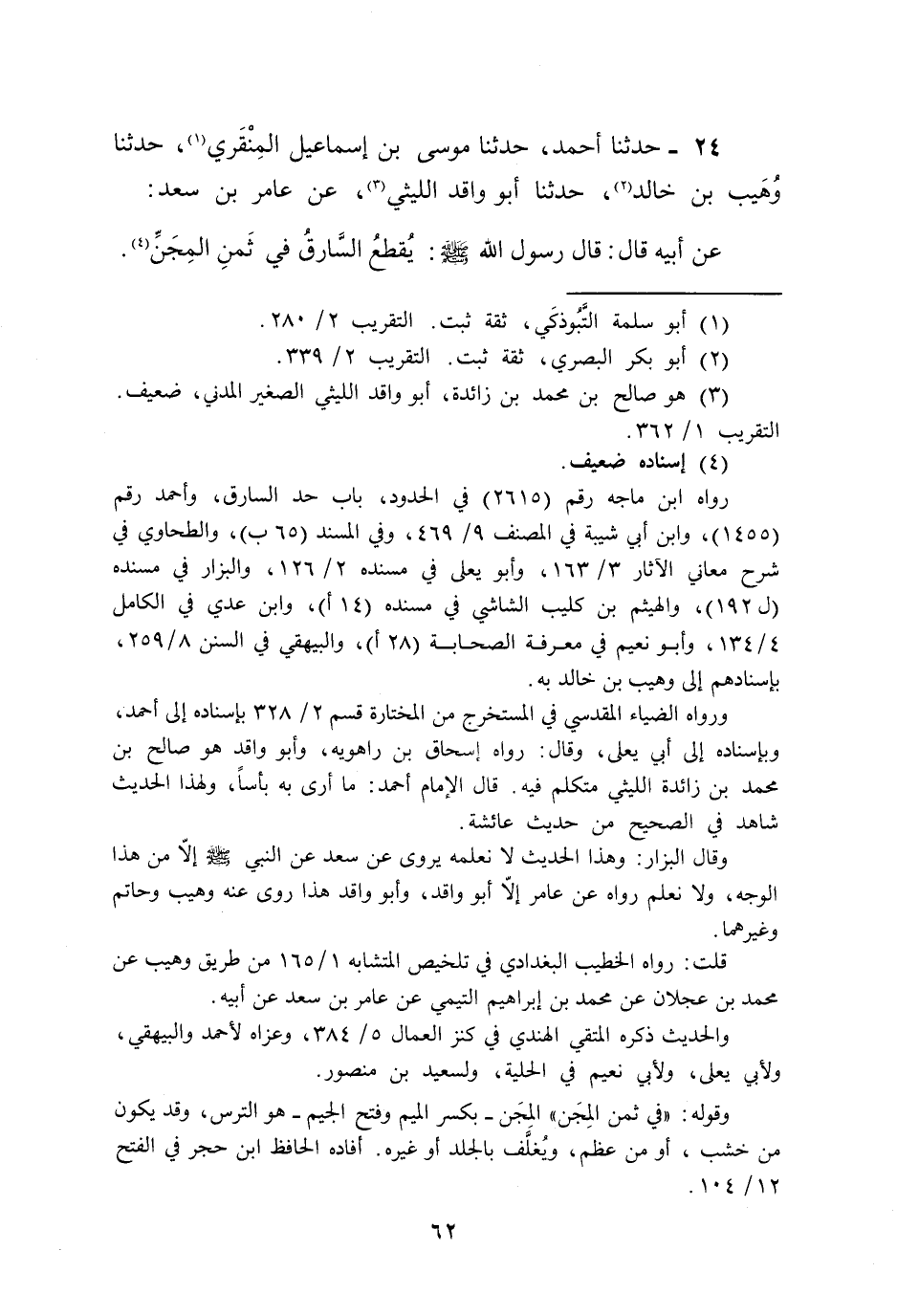 24 - حَدَّثَنَا أَحْمَدُ، حَدَّثَنَا مُوسَى بْنُ إِسْمَاعِيلَ الْمِنْقَرِيُّ , حَدَّثَنَا وُهَيْبُ بْنُ خَالِدٍ , حَدَّثَنَا أَبُو وَاقِدٍ اللَّيْثِيُّ , عَنْ عَامِرِ بْنِ سَعْدٍ , عَنْ أَبِيهِ قَالَ: قَالَ رَسُولُ اللَّهِ صَلَّى اللهُ عَلَيْهِ وَسَلَّمَ: «§يُقْطَعُ السَّارِقُ فِي ثَمَنِ الْمِجَنِّ»