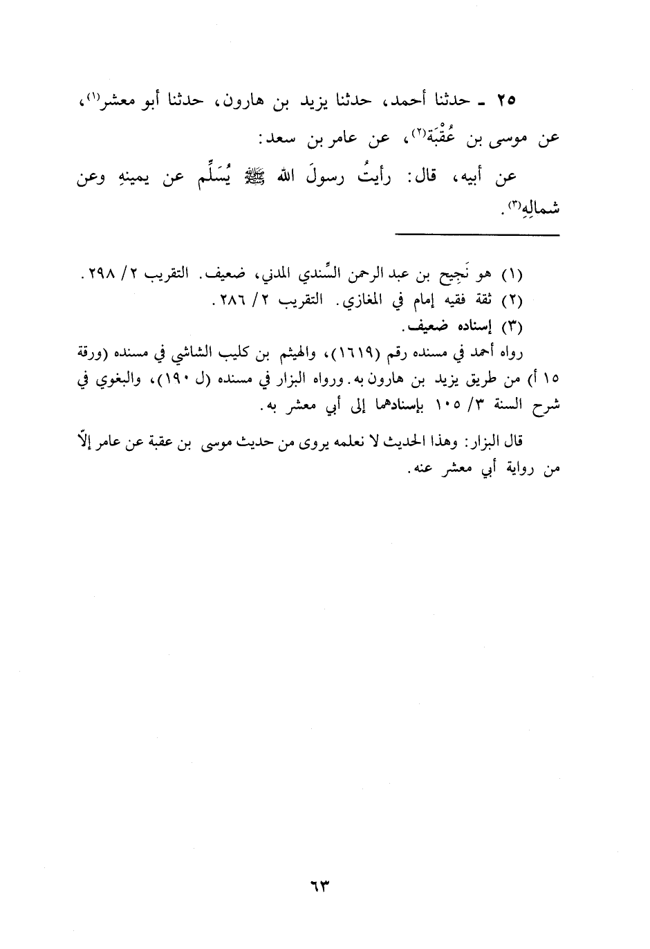 25 - حَدَّثَنَا أَحْمَدُ، حَدَّثَنَا يَزِيدُ بْنُ هَارُونَ , حَدَّثَنَا أَبُو مَعْشَرٍ , عَنْ مُوسَى بْنِ عُقْبَةَ , عَنْ عَامِرِ بْنِ سَعْدٍ , عَنْ أَبِيهِ قَالَ: «§رَأَيْتُ رَسُولَ اللَّهِ صَلَّى اللهُ عَلَيْهِ وَسَلَّمَ يُسَلِّمُ عَنْ يَمِينِهِ وَعَنْ شِمَالِهِ»