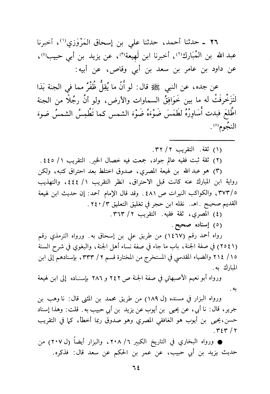 26 - حَدَّثَنَا أَحْمَدُ، حَدَّثَنَا عَلِيُّ بْنُ إِسْحَاقَ الْمَرْوَزِيُّ , أَخْبَرَنَا عَبْدُ اللَّهِ بْنُ الْمُبَارَكِ , أَخْبَرَنَا ابْنُ لَهِيعَةَ , عَنْ يَزِيدَ بْنِ أَبِي حَبِيبٍ , عَنْ دَاوُدَ بْنِ عَامِرِ بْنِ سَعْدِ بْنِ أَبِي وَقَّاصٍ , عَنْ أَبِيهِ , عَنْ جَدِّهِ , عَنِ النَّبِيِّ صَلَّى اللهُ عَلَيْهِ وَسَلَّمَ قَالَ: «§لَوْ أَنَّ مَا يُقِلُّ ظُفُرٌ مِمَّا فِي الْجَنَّةِ بَدَا لَتَزَخْرَفَتْ لَهُ مَا بَيْنَ خَوَافِقِ السَّمَوَاتِ وَالْأَرْضِ وَلَوْ أَنَّ رَجُلًا مِنَ الْجَنَّةِ اطَّلَعَ فَبَدَتْ أَسَاوِرُهُ لَطَمَسَ ضَوْءُهُ ضَوْءَ الشَّمْسِ كَمَا تَطْمِسُ الشَّمْسُ ضَوْءَ النُّجُومِ»