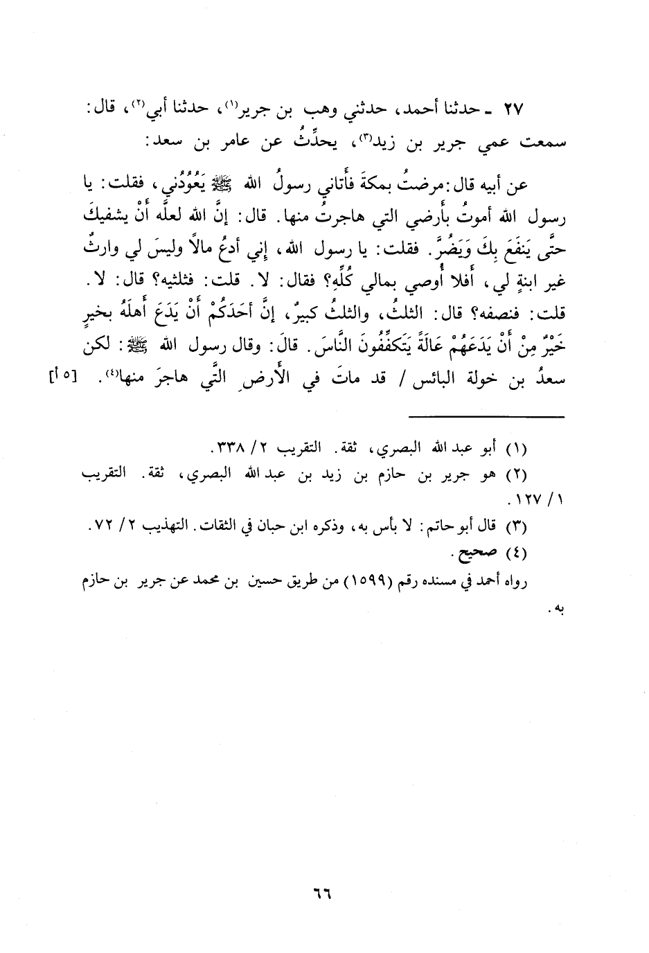 27 - حَدَّثَنَا أَحْمَدُ، حَدَّثَنِي وَهْبُ بْنُ جَرِيرٍ , حَدَّثَنَا أَبِي قَالَ: سَمِعْتُ عَمِّي جَرِيرَ بْنَ زَيْدٍ يُحَدِّثُ عَنْ عَامِرِ بْنِ سَعْدٍ عَنْ أَبِيهِ قَالَ: مَرِضْتُ بِمَكَّةَ فَأَتَانِي رَسُولُ اللَّهِ صَلَّى اللهُ عَلَيْهِ وَسَلَّمَ يَعُودُنِي فَقُلْتُ: يَا رَسُولَ اللَّهِ أَمُوتُ بِأَرْضِي الَّتِي هَاجَرْتُ مِنْهَا قَالَ: «§إِنَّ اللَّهَ لَعَلَّهُ أَنْ يَشْفِيَكَ حَتَّى يَنْفَعَ بِكَ وَيُضَرَّ» ، فَقُلْتُ: يَا رَسُولَ اللَّهِ إِنِّي أَدَعُ مَالًا وَلَيْسَ لِي وَارِثٌ غَيْرُ ابْنَةٍ لِي أَفَلَا أُوصِي بِمَالِي كُلِّهِ؟ فَقَالَ: «لَا» ، قُلْتُ: فَثُلُثَيْهِ؟ قَالَ: «لَا» ، قُلْتُ: فَنِصْفِهِ؟ قَالَ: «الثُّلُثُ، وَالثُّلُثُ كَبِيرٌ إِنَّ أَحَدَكُمْ أَنْ يَدَعَ أَهْلَهُ بِخَيْرٍ خَيْرٌ مِنْ أَنْ يَدَعَهُمْ عَالَةً يَتَكَفَّفُونَ النَّاسَ» ، قَالَ: وَقَالَ رَسُولُ اللَّهِ صَلَّى اللهُ عَلَيْهِ وَسَلَّمَ: «لَكِنْ سَعْدُ بْنُ خَوْلَةَ الْبَائِسُ قَدْ مَاتَ فِي الْأَرْضِ الَّتِي هَاجَرَ مِنْهَا»