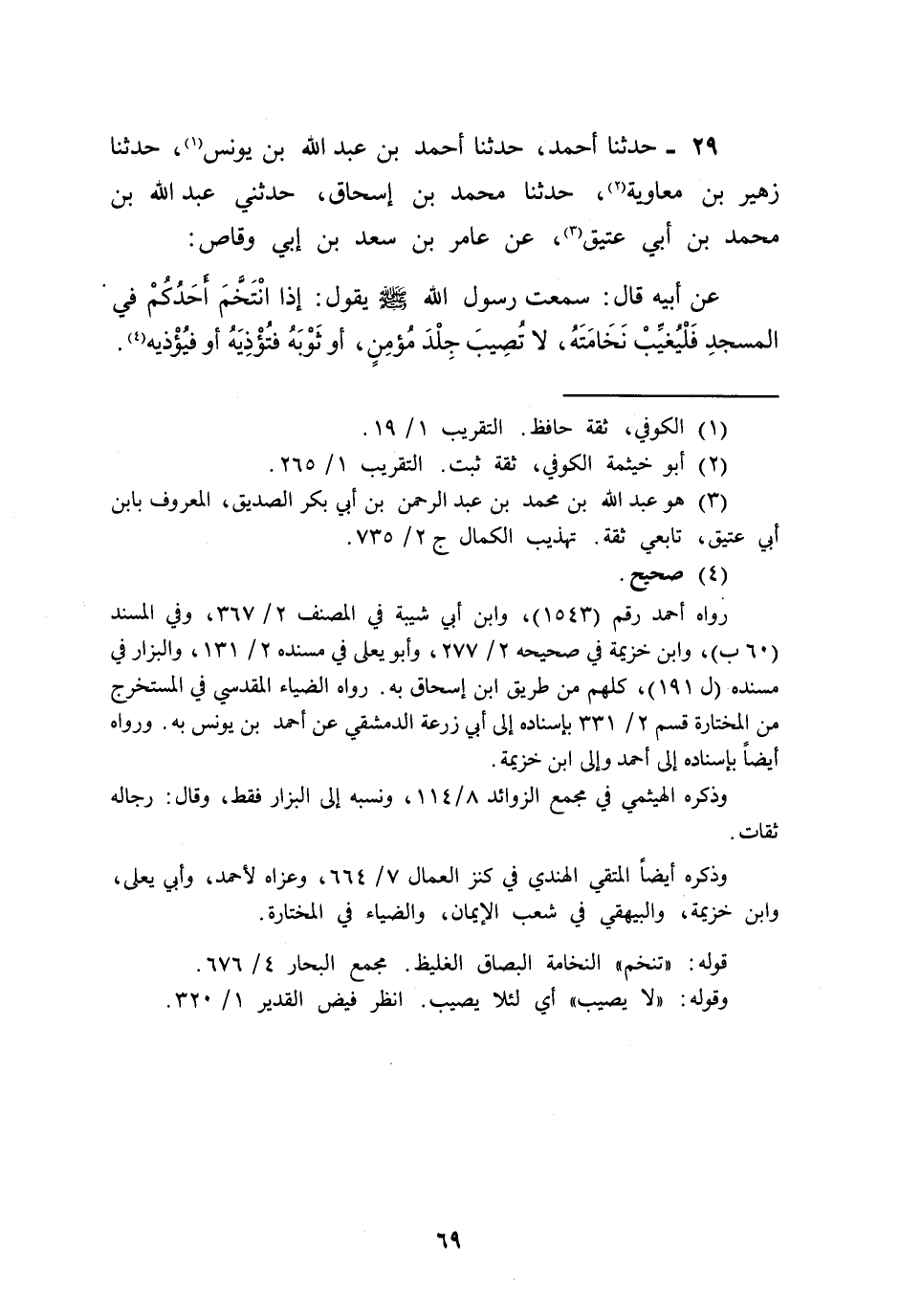 29 - حَدَّثَنَا أَحْمَدُ، حَدَّثَنَا أَحْمَدُ بْنُ عَبْدِ اللَّهِ بْنِ يُونُسَ , حَدَّثَنَا زُهَيْرُ بْنُ مُعَاوِيَةَ , حَدَّثَنَا مُحَمَّدُ بْنُ إِسْحَاقَ , حَدَّثَنِي عَبْدُ اللَّهِ بْنُ مُحَمَّدِ بْنِ أَبِي عَتِيقٍ , عَنْ عَامِرِ بْنِ سَعْدِ بْنِ أَبِي وَقَّاصٍ , عَنْ أَبِيهِ قَالَ: سَمِعْتُ رَسُولَ اللَّهِ صَلَّى اللهُ عَلَيْهِ وَسَلَّمَ، يَقُولُ: «§إِذَا انْتَخَمَ أَحَدُكُمْ فِي الْمَسْجِدِ، فَلْيُغَيِّبْ نُخَامَتَهُ، لَا تُصِيبُ جِلْدَ مُؤْمِنٍ أَوْ ثَوْبَهُ فَتُؤْذِيَهُ، أَوْ فَيُؤْذِيَهُ»