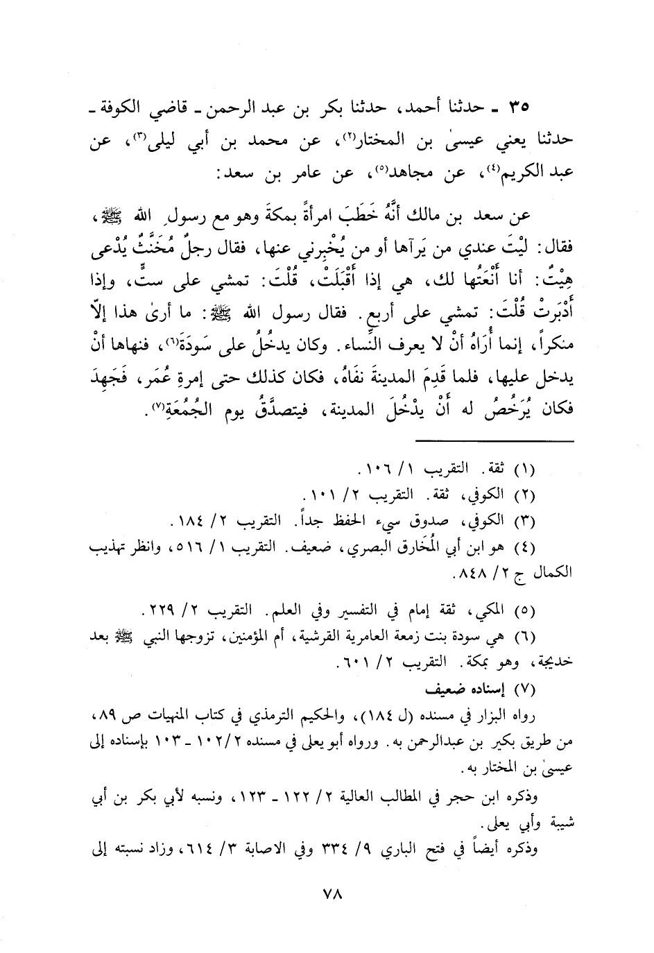 35 - حَدَّثَنَا أَحْمَدُ، حَدَّثَنَا بَكْرُ بْنُ عَبْدِ الرَّحْمَنِ قَاضِي الْكُوفَةِ , حَدَّثَنَا يَعْنِي عِيسَى بْنَ الْمُخْتَارِ , عَنْ مُحَمَّدِ بْنِ أَبِي لَيْلَى , عَنْ عَبْدِ الْكَرِيمِ , عَنْ مُجَاهِدٍ , عَنْ عَامِرِ بْنِ سَعْدٍ , عَنْ سَعْدِ بْنِ مَالِكٍ أَنَّهُ خَطَبَ امْرَأَةً بِمَكَّةَ وَهُوَ مَعَ رَسُولِ اللَّهِ صَلَّى اللهُ عَلَيْهِ وَسَلَّمَ فَقَالَ: لَيْتَ عِنْدِي مَنْ يَرَاهَا أَوْ مَنْ يُخْبِرُنِي عَنْهَا فَقَالَ رَجُلٌ مُخَنَّثٌ يُدْعَى: هِيتٌ: أَنَا أَنْعَتُهَا لَكَ هِيَ إِذَا أَقْبَلَتْ قُلْتَ تَمْشِي عَلَى سِتٍّ وَإِذَا أَدْبَرَتْ قُلْتَ تَمْشِي عَلَى أَرْبَعٍ فَقَالَ رَسُولُ اللَّهِ صَلَّى اللهُ عَلَيْهِ وَسَلَّمَ: «§مَا أَرَى هَذَا إِلَّا مُنْكَرًا إِنَّمَا أَرَاهُ أَنْ لَا يَعْرِفَ النِّسَاءَ» وَكَانَ يَدْخُلُ عَلَى سَوْدَةَ فَنَهَاهَا أَنْ يَدْخُلَ عَلَيْهَا، فَلَمَّا قَدِمَ الْمَدِينَةَ نَفَاهُ فَكَانَ كَذَلِكَ حَتَّى إِمْرَةِ عُمَرَ فَجَهَدَ فَكَانَ يُرَخِّصُ لَهُ أَنْ يَدْخُلَ الْمَدِينَةَ فَيَتَصَدَّقُ يَوْمَ الْجُمُعَةِ