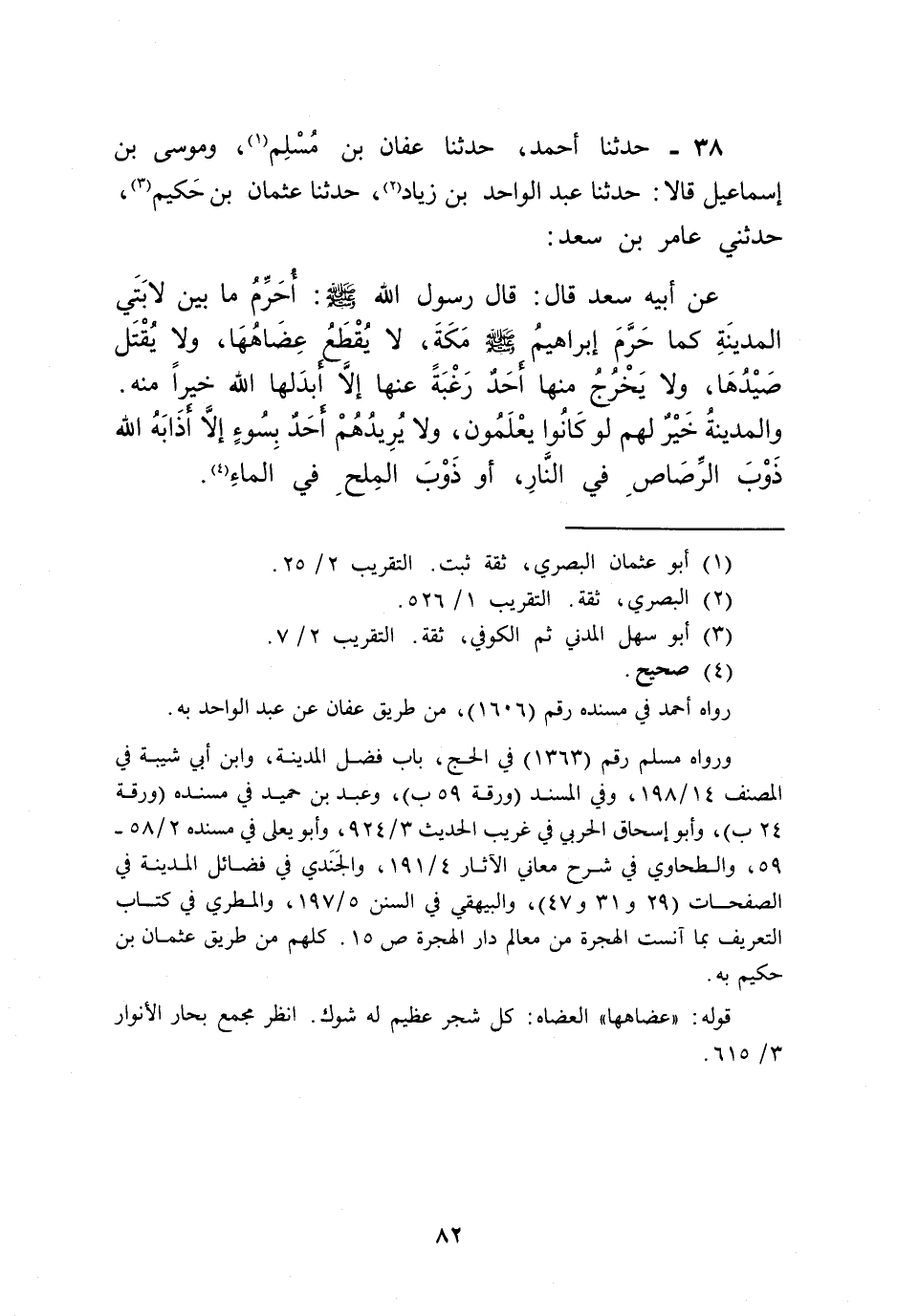38 - حَدَّثَنَا أَحْمَدُ، حَدَّثَنَا عَفَّانُ بْنُ مُسْلِمٍ , وَمُوسَى بْنُ إِسْمَاعِيلَ قَالَا: حَدَّثَنَا عَبْدُ الْوَاحِدِ بْنُ زِيَادٍ , حَدَّثَنَا عُثْمَانُ بْنُ حَكِيمٍ , حَدَّثَنِي عَامِرُ بْنُ سَعْدٍ , عَنْ أَبِيهِ سَعْدٍ قَالَ: قَالَ رَسُولُ اللَّهِ صَلَّى اللهُ عَلَيْهِ وَسَلَّمَ: «§أُحَرِّمُ مَا بَيْنَ لَابَتَيِ الْمَدِينَةِ كَمَا حَرَّمَ إِبْرَاهِيمُ صَلَّى اللهُ عَلَيْهِ وَسَلَّمَ مَكَّةَ لَا يُقْطَعُ عِضَاهُهَا وَلَا يُقْتَلُ صَيْدُهَا، وَلَا يُخْرَجُ مِنْهَا أَحَدٌ رَغْبَةً عَنْهَا إِلَّا أَبْدَلَهَا اللَّهُ خَيْرًا مِنْهُ، وَالْمَدِينَةُ خَيْرٌ لَهُمْ لَوْ كَانُوا يَعْلَمُونَ، وَلَا يُرِيدُهُمْ أَحَدٌ بِسُوءٍ إِلَّا أَذَابَهُ اللَّهُ ذَوْبَ الرَّصَاصِ فِي النَّارِ، أَوْ ذَوْبَ الْمِلْحِ فِي الْمَاءِ»