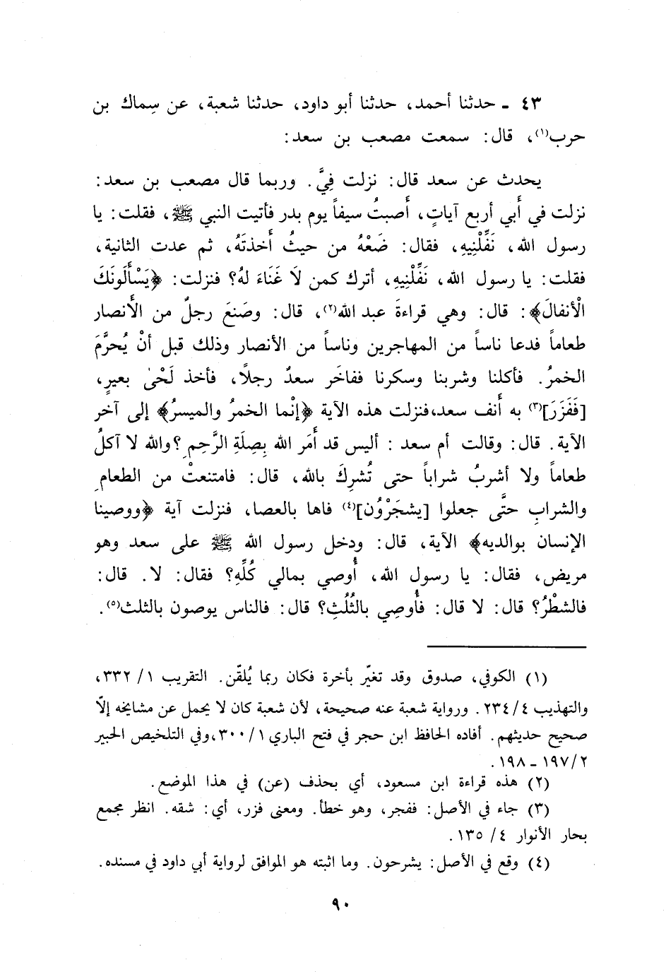 43 - حَدَّثَنَا أَحْمَدُ، حَدَّثَنَا أَبُو دَاوُدَ , حَدَّثَنَا , شُعْبَةُ , عَنْ سِمَاكِ بْنِ حَرْبٍ قَالَ: سَمِعْتُ مُصْعَبَ بْنَ سَعْدٍ يُحَدِّثُ عَنْ سَعْدٍ قَالَ: نَزَلَتْ فِيَّ وَرُبَّمَا قَالَ مُصْعَبُ بْنُ سَعْدٍ نَزَلَتْ فِي أَبِي أَرْبَعُ آيَاتٍ: أَصَبْتُ سَيْفًا يَوْمَ بَدْرٍ فَأَتَيْتُ النَّبِيَّ صَلَّى اللهُ عَلَيْهِ وَسَلَّمَ فَقُلْتُ: يَا رَسُولَ اللَّهِ نَفِّلْنِيهِ فَقَالَ: «§ضَعْهُ مِنْ حَيْثُ أَخَذْتَهُ» ، ثُمَّ عُدْتُ الثَّانِيَةَ فَقُلْتُ: يَا رَسُولَ اللَّهِ نَفِّلْنِيهِ أُتْرَكُ كَمَنْ لَا غَنَاءَ لَهُ فَنَزَلَتْ: (يَسْأَلُونَكَ الْأَنْفَالَ) قَالَ: وَهِيَ قِرَاءَةُ عَبْدِ اللَّهِ قَالَ: وَصَنَعَ رَجُلٌ مِنَ الْأَنْصَارِ طَعَامًا فَدَعَا نَاسًا مِنَ الْمُهَاجِرِينَ وَنَاسًا مِنَ الْأَنْصَارِ وَذَلِكَ قَبْلَ أَنْ يُحَرِّمَ الْخَمْرَ، فَأَكَلْنَا وَشَرِبْنَا وَسَكِرْنَا فَفَاخَرَ سَعْدٌ رَجُلًا فَأَخَذَ لِحَى بَعِيرٍ فَفَزَرَ بِهِ أَنْفَ سَعْدٍ فَنَزَلَتْ هَذِهِ الْآيَةُ: {إِنَّمَا الْخَمْرُ وَالْمَيْسِرُ} [المائدة: 90] إِلَى آخِرِ الْآيَةِ قَالَ: وَقَالَتْ أُمُّ سَعْدٍ: أَلَيْسَ قَدْ أَمَرَ اللَّهُ بِصِلَةِ الرَّحِمِ؟ وَاللَّهِ لَا آكُلُ طَعَامًا وَلَا أَشْرَبُ شَرَابًا حَتَّى تُشْرِكَ بِاللَّهِ قَالَ: فَامْتَنَعَتْ مِنَ الطَّعَامِ وَالشَّرَابِ حَتَّى جَعَلُوا يَشْجِرُونَ فَاهَا بِالْعَصَا فَنَزَلَتْ آيَةُ: {وَوَصَّيْنَا الْإِنْسَانَ بِوَالِدَيْهِ} [العنكبوت: 8] الْآيَةَ قَالَ: وَدَخَلَ رَسُولُ اللَّهِ صَلَّى اللهُ عَلَيْهِ وَسَلَّمَ عَلَى سَعْدٍ، وَهُوَ مَرِيضٌ، فَقَالَ: يَا رَسُولَ اللَّهِ أُوصِي بِمَالِي كُلِّهِ فَقَالَ: «لَا» ، قَالَ: فَالشَّطْرُ؟ قَالَ: «لَا» ، قَالَ: فَأُوصِي بِالثُّلُثِ؟ قَالَ: «فَالنَّاسُ يُوصُونَ بِالثُّلُثِ»