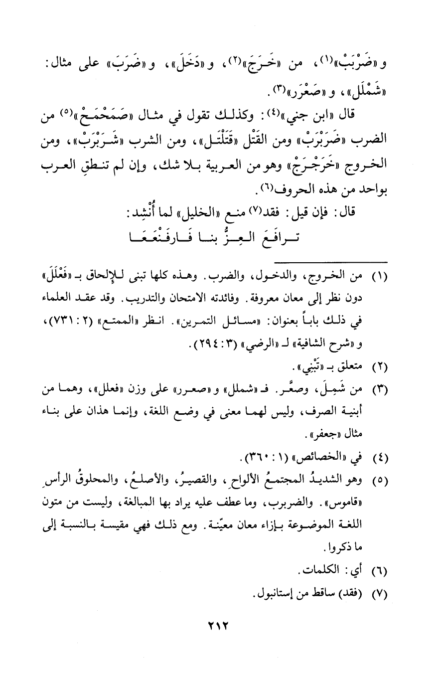 " وكذلك تقول في مثال (صمحمح) من الضرب: ضربرب ومن القتل قتلتل ومن الشرب شربرب ومن الخروج خرجرج وهو من العربية بلا شك وإن لم تنطق العرب بواحد من هذه الحروف ".