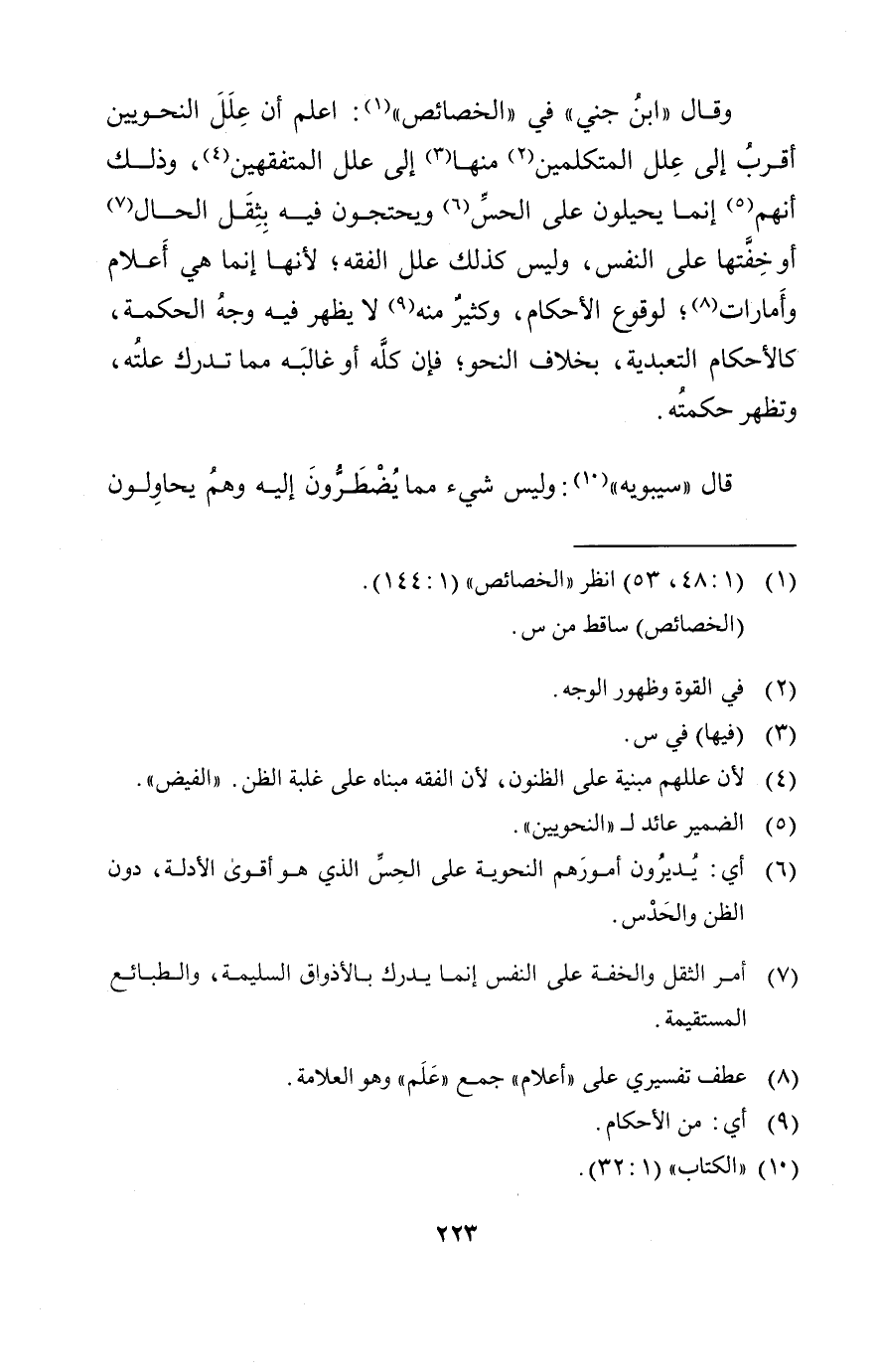 " اعلم أن علل النحويين أقرب إلى علل المتكلمين منها إلى علل المتفقهين وذلك أنهم إنما يحيلون على الحس ويحتجون فيه بثقل الحال أو خفتها على النفس وليس كذلك علل الفقه لأنها إنما هي أعلام وأمارات لوقوع الأحكام وكثير منه لا يظهر فيه وجه الحكمة كالأحكام التعبدية بخلاف النحو فإن كله أو غالبه مما تدرك علته وتظهر حكمته ".