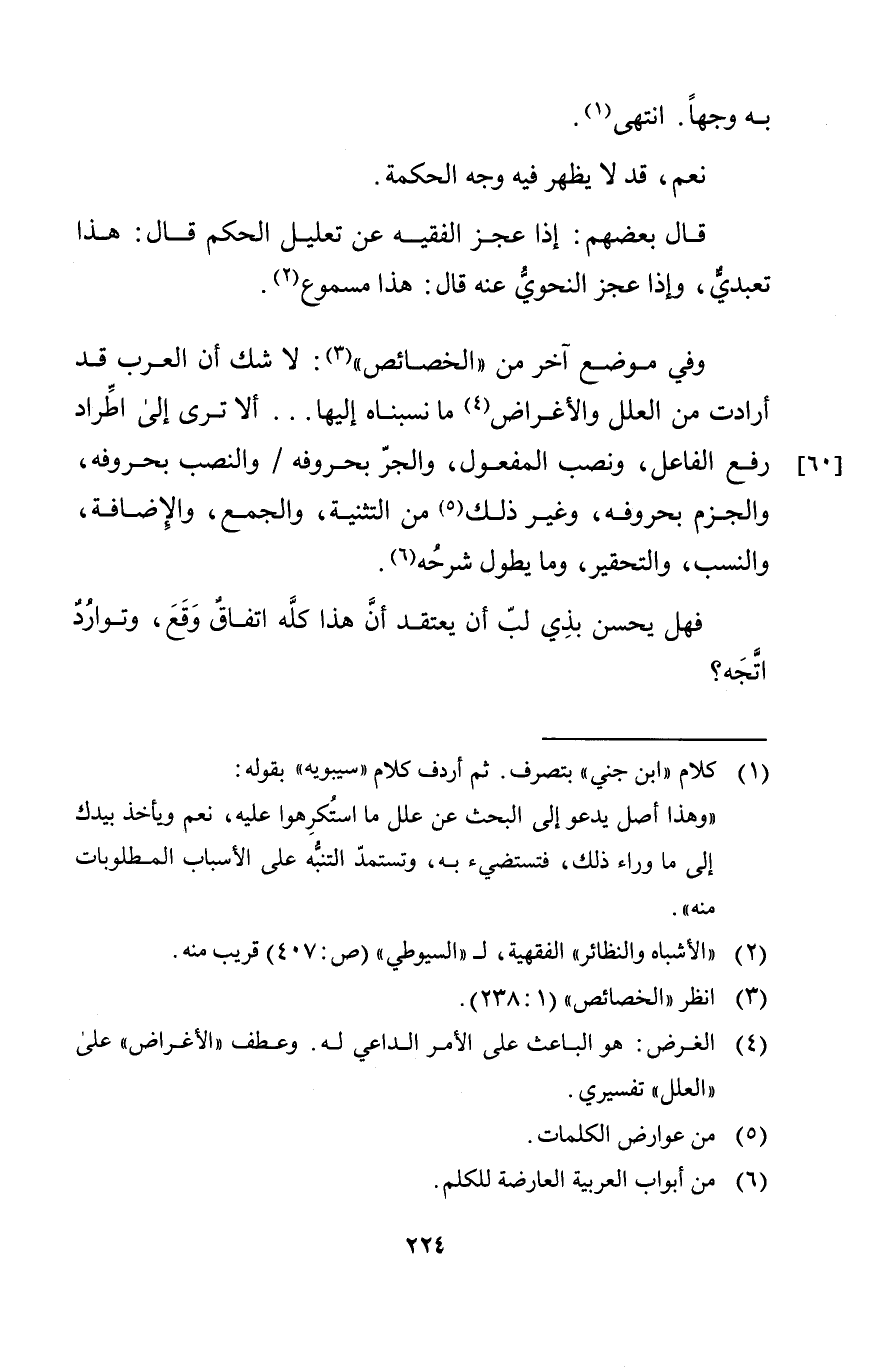 لاشك أن العرب قد أرادت من العلل والأعراض ما نسبناه إليها ألا ترى إلى أطراد رفع الفاعل ونصب المفعول والجر بحروفه والجزم بحروفه وغير ذلك من التثنية والجمع والإضافة والنسب والتحقير وما يطول شرحه.