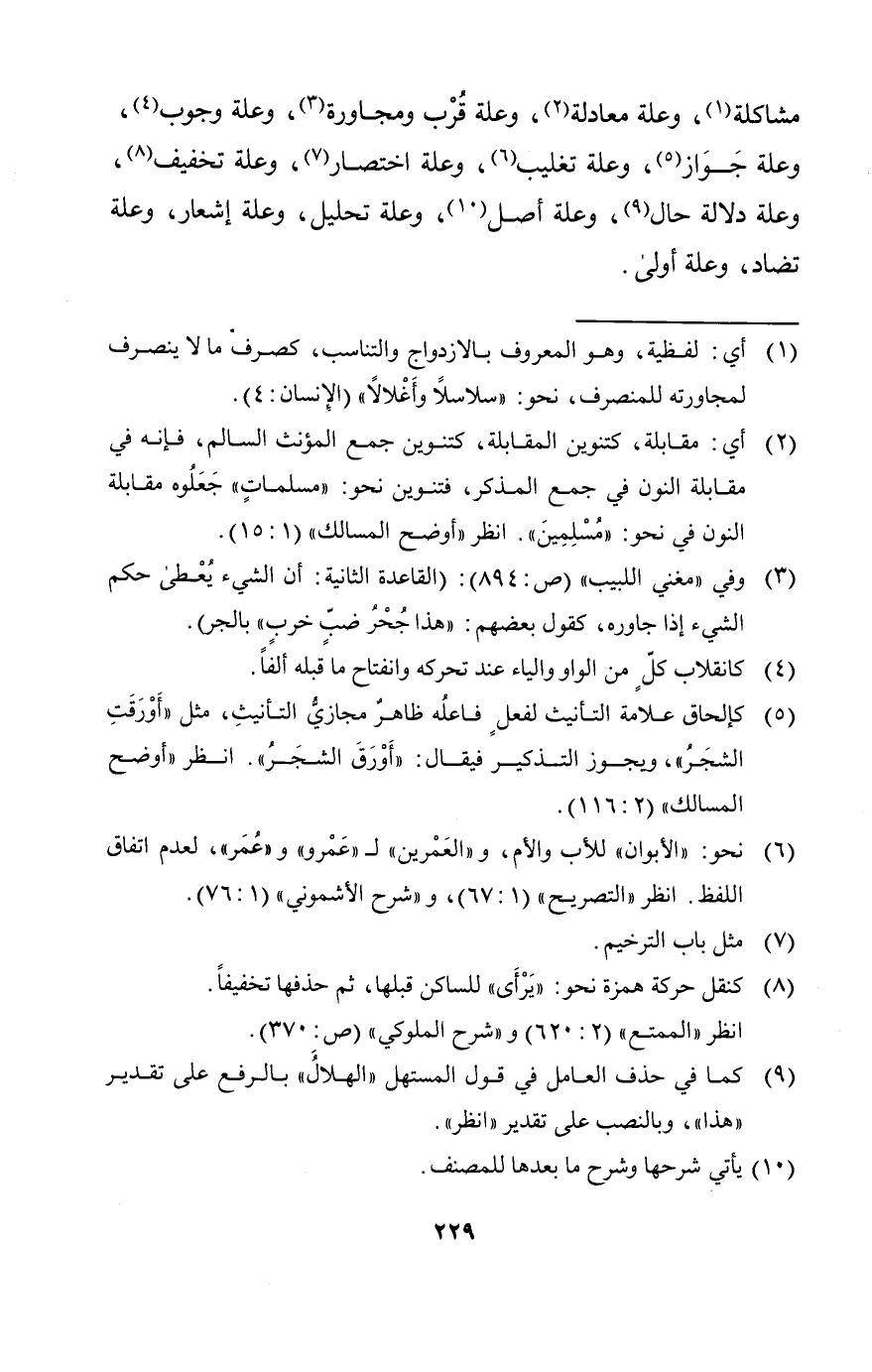مشاكلة، وعلة معادلة، وعلة قرب ومجاورة، وعلة وجوب، وعلة جواز، وعلة تغليب، وعلة اختصار، وعلة تخفيف، وعلة دلالة حال، وعلة أصل، وعلة تحليل، وعلة إشعار، وعلة تضاد، وعلة أولى.