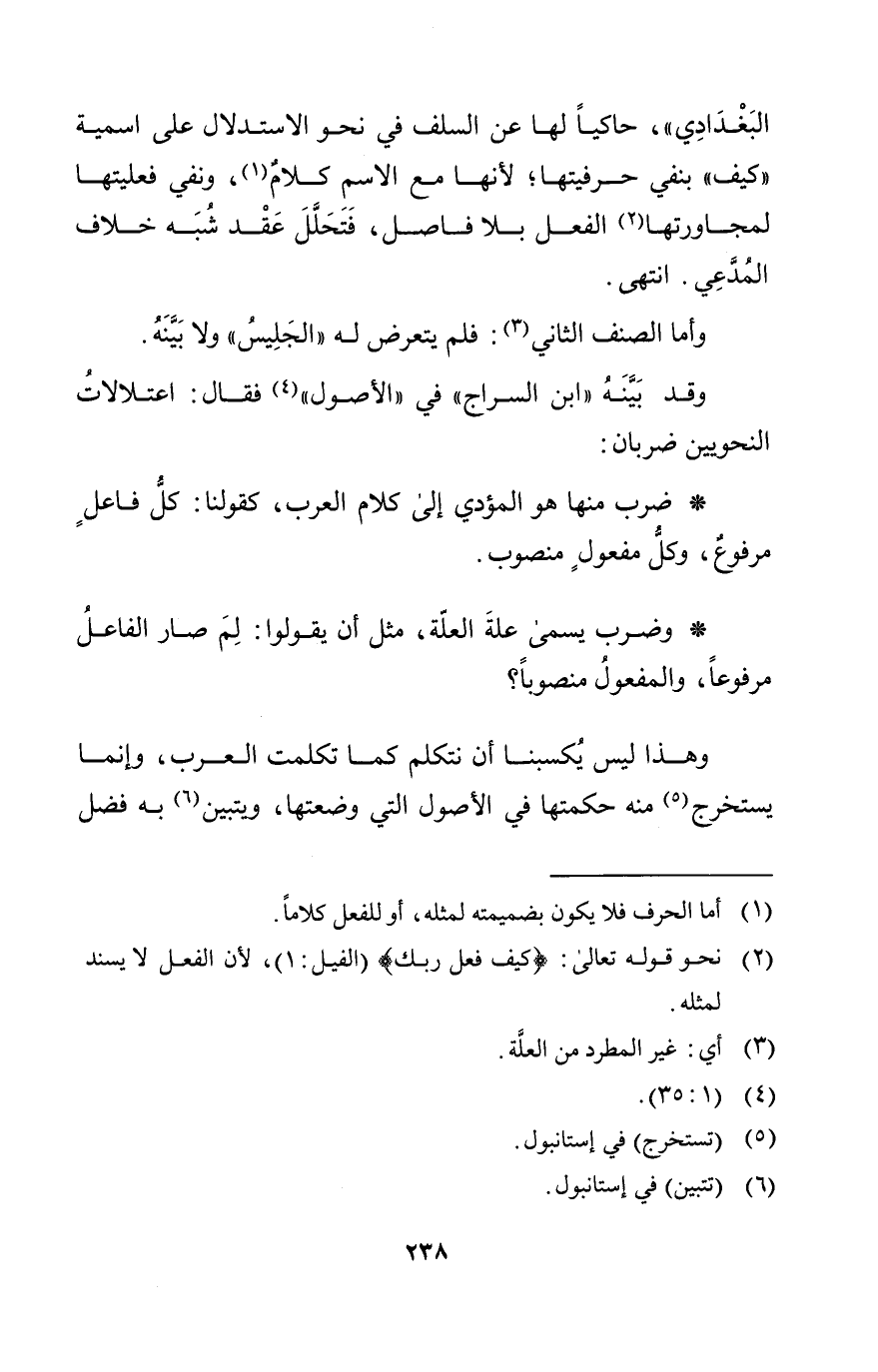 البغدادي حاكيا لها عن السلف في نحو الاستدلال على اسمية كيف بنفي حرفيتها لأنها مع الاسم كلام ونفي فعليتها لمجاورتها الفعل بلا فاصل فتحلل عقد شبه خلاف المدعي "
