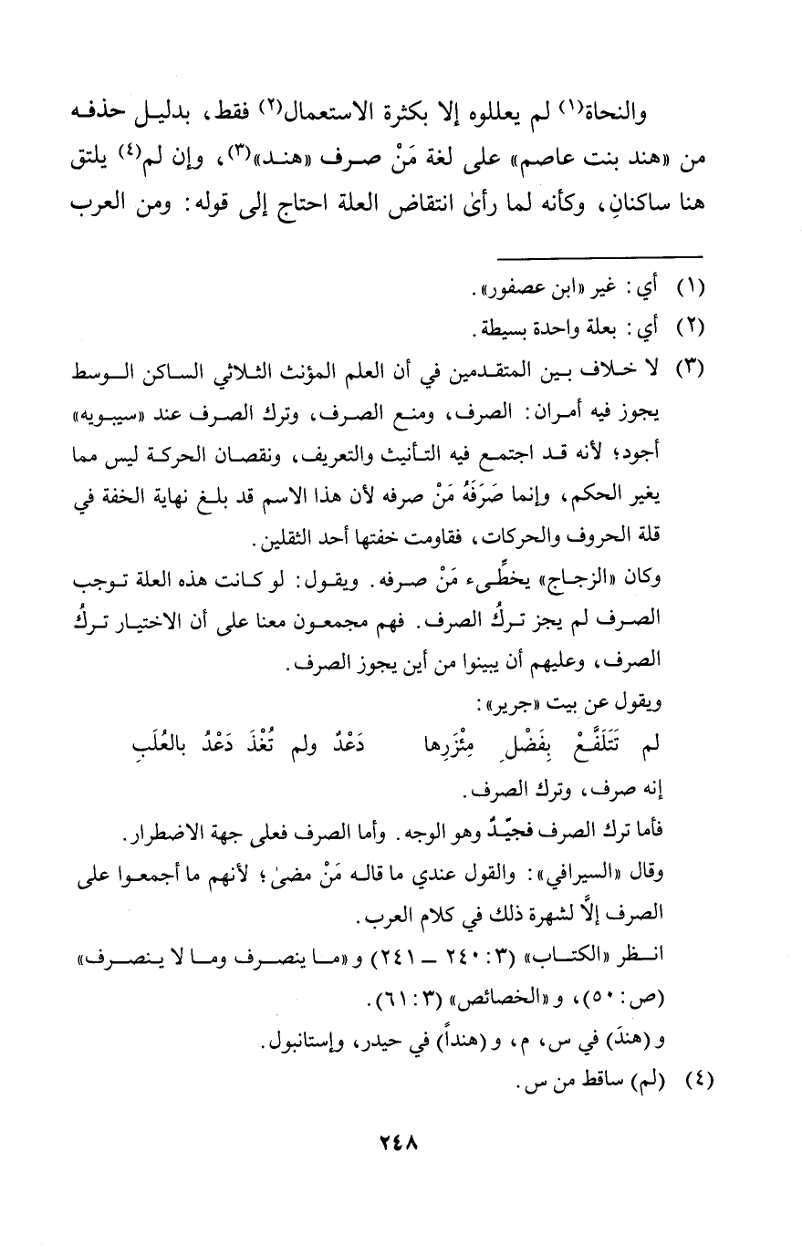 والنحاة لم يعللوه إلا بكثرة الاستعمال فقط بدليل حذفه م (هند بنت عاصم) على لغة من صرف هندا وإن لم يلتق هنا ساكنان وكأنه لما رأى انتقاض العلة احتاج إلى قوله: