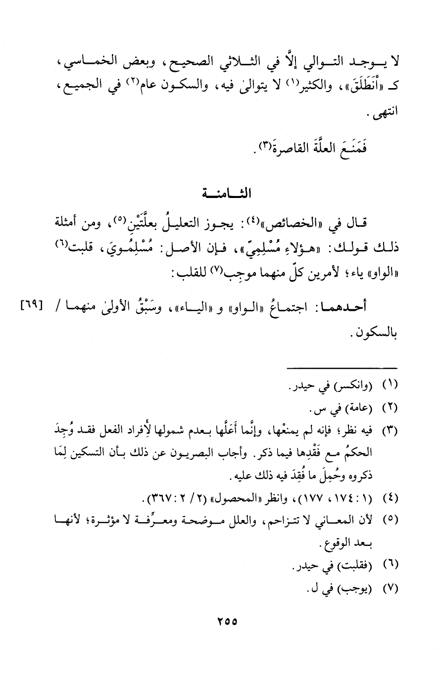 " يجوز التعليل بعلتين ومن أمثلة ذلك قولك: هؤلاء مسلمي فإن الأصل مسلموي فقلبت الواو ياء لأمرين كل منهما موجب للقلب: