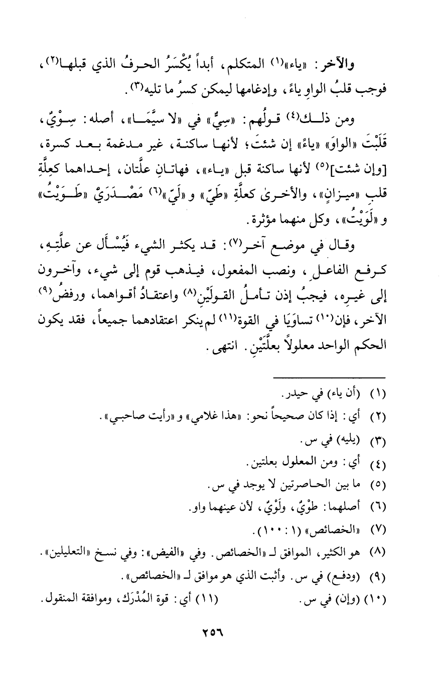 قد يكثر الشيء فيسأل عن علته كرفع الفاعل ونصب المفعول فيذهب قوم إلى شيء وآخرون إلى غيره فيجب إذن تأمل القولين واعتقاد أقواهما ورفض الآخر فإن تساويا في القوة لم ينكر اعتقادهما جميعا فقد يكون الحكم الواحد معلولا بعلتين " انتهى