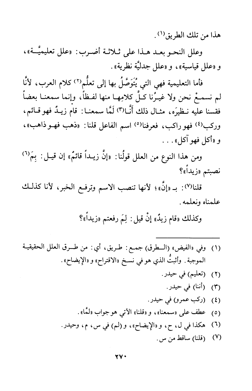 وعلل النحو بعد هذا على ثلاثة أضرب: علل تعليمية وعلل قياسية وعلل جدلية نظرية.