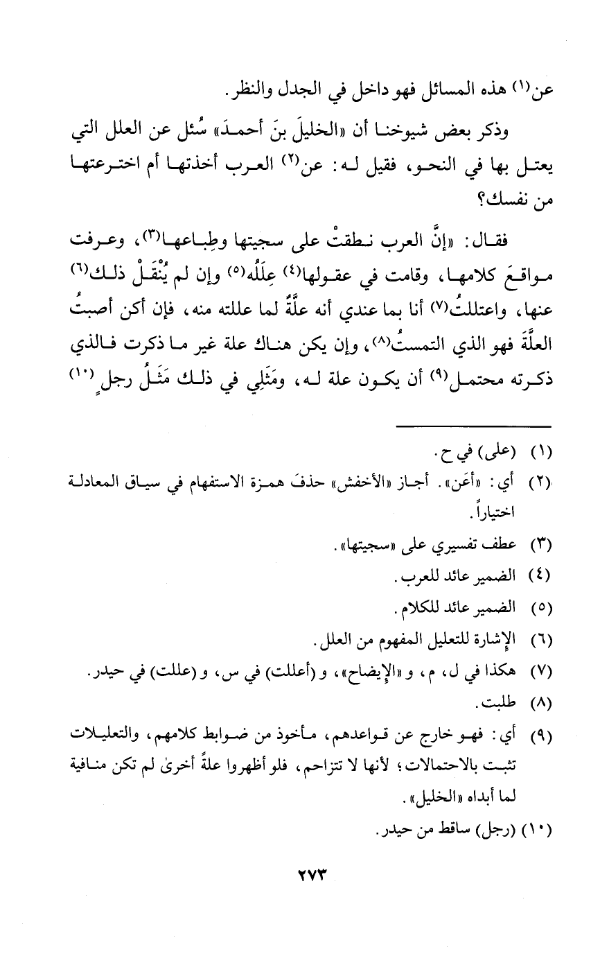 فقال: إن العرب نطقت على سجيتها وطباعها وعرفت مواقع كلامها وقام في عقولها علله وإن لم ينقل ذلك عنها واعتللت أنا بما عندي أنه علة لما عللته منه فإن أكن أصبت العلة فهو الذي التمست وإن تكن هناك علة غير ما ذكرت فالذي ذكرته محتمل أن يكون علة له ومثلي في ذلك مثل رجل