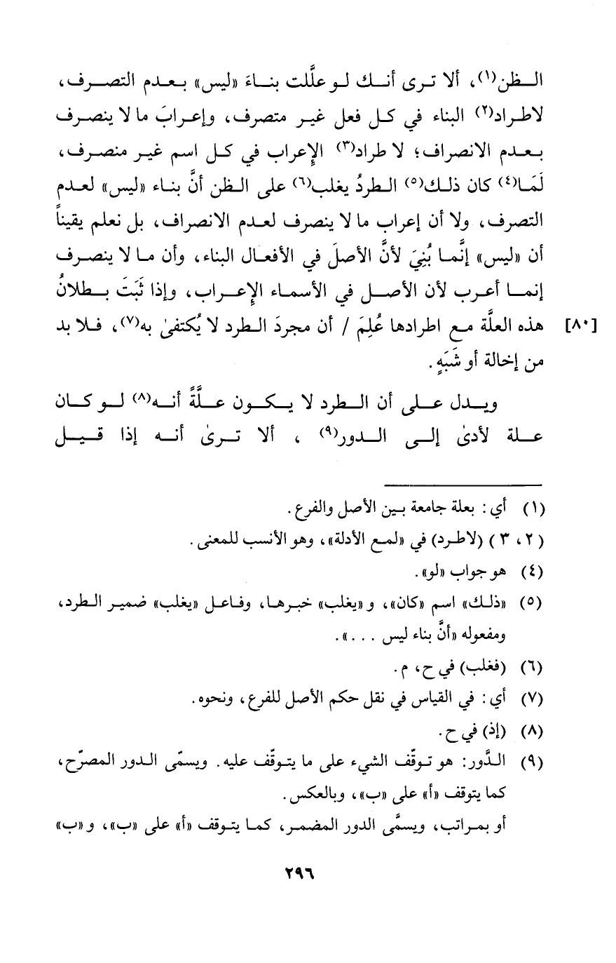 الظن؛ ألا ترى أنك لو عللت بناء (ليس) بعدم التصرف لاطراد البناء في كل فعل غير متصرف وإعراب ما لاينصرف لما كان ذلك الطرد يغلب على الظن أن بناء ليس لعدم التصرف ولا أن إعراب ما لا ينصرف لعدم الانصراف بل نعلم يقينا أن ليس إنما بني لأن الأصل في الأفعال البناء وأن ما لاينصرف إنما أعرب لأن الأصل في الأسماء الإعراب.