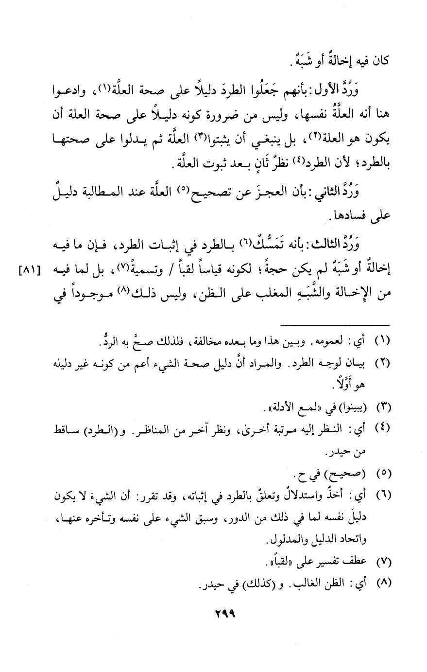 ورد الأول: بأنهم جعلوا الطرد دليلا على صحة العلة وادعوا هنا أنها العلة نفسها وليس من ضرورة كونه دليلا على صحة العلة أن يكون هو العلة؛ بل ينبغي أن يثبتوا العلة، ثم يدلوا على صحتها بالطرد؛ لأن الطرد نظر ثانٍ بعد ثبوت العلة.
