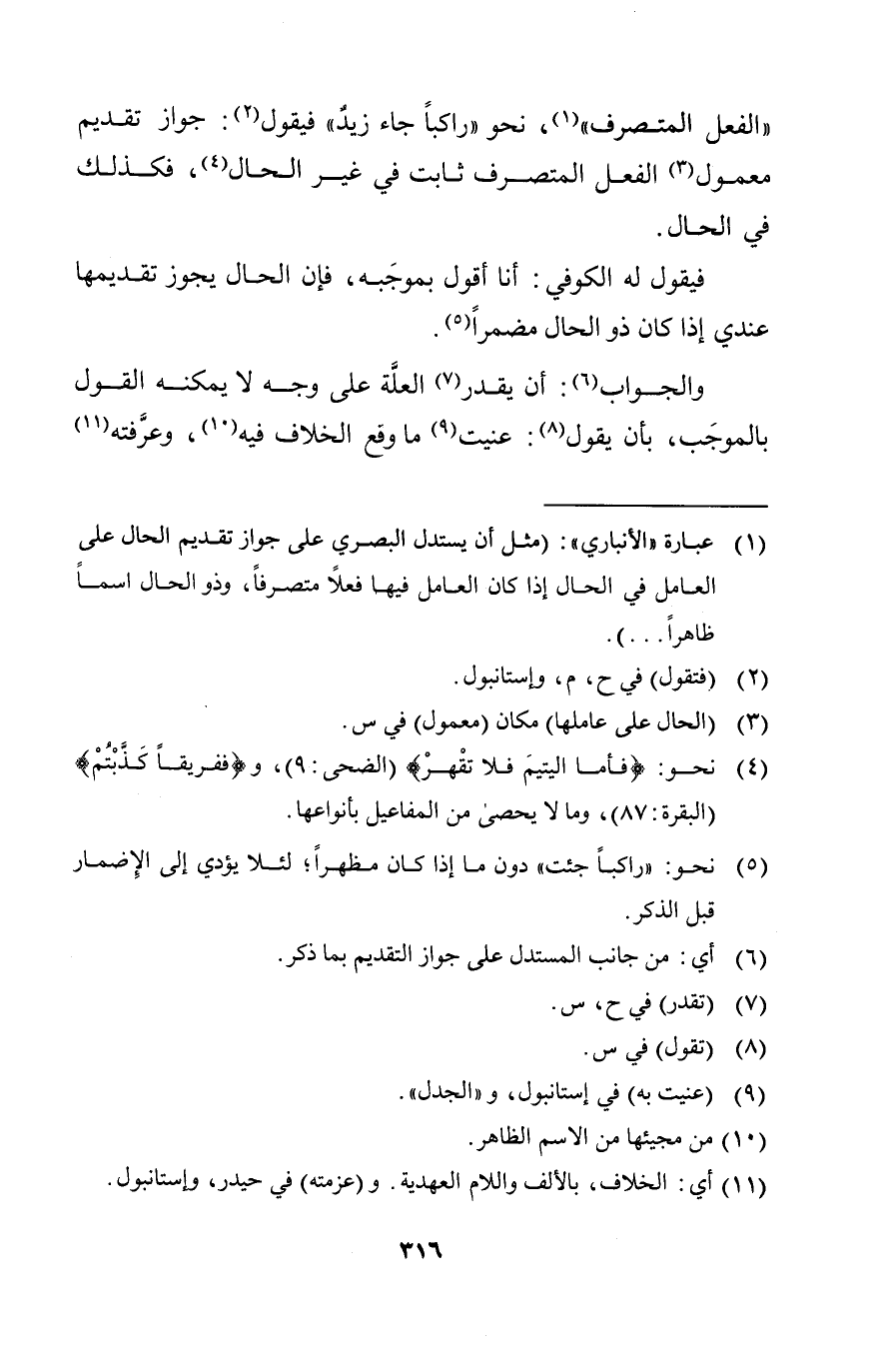 فيقول له الكوفي: أنا أقول بموجبه؛ فإن الحال يجوز تقديمها عندي إذا كان ذو الحال مضمرا.