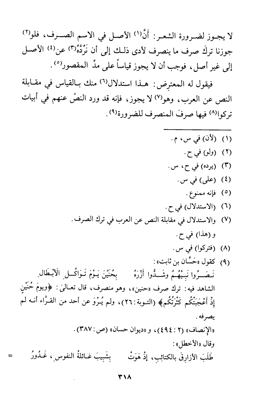فيقول له المعترض: هذا استدلال منك بالقياس في مقابلة النص عن العرب وهو لا يجوز فإنه قد ورد النص عنهم في أبيات تركوا فيها صرف المنصرف للضرورة.