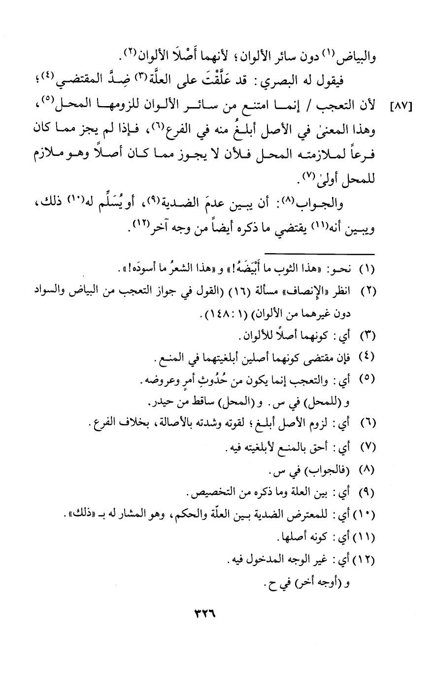 فيقول له البصري: قد علقت على العلة ضد المقتضي لأن التعجب إنما امتنع من سائر الألوان للزومها المحل وهذا المعنى في الأصل أبلغ منه في الفرع فإذا لم يجز مما كان فرعا لملازمته المحل فلأن لا يجوز مما كان أصلا وهو ملازم للمحل أولى.