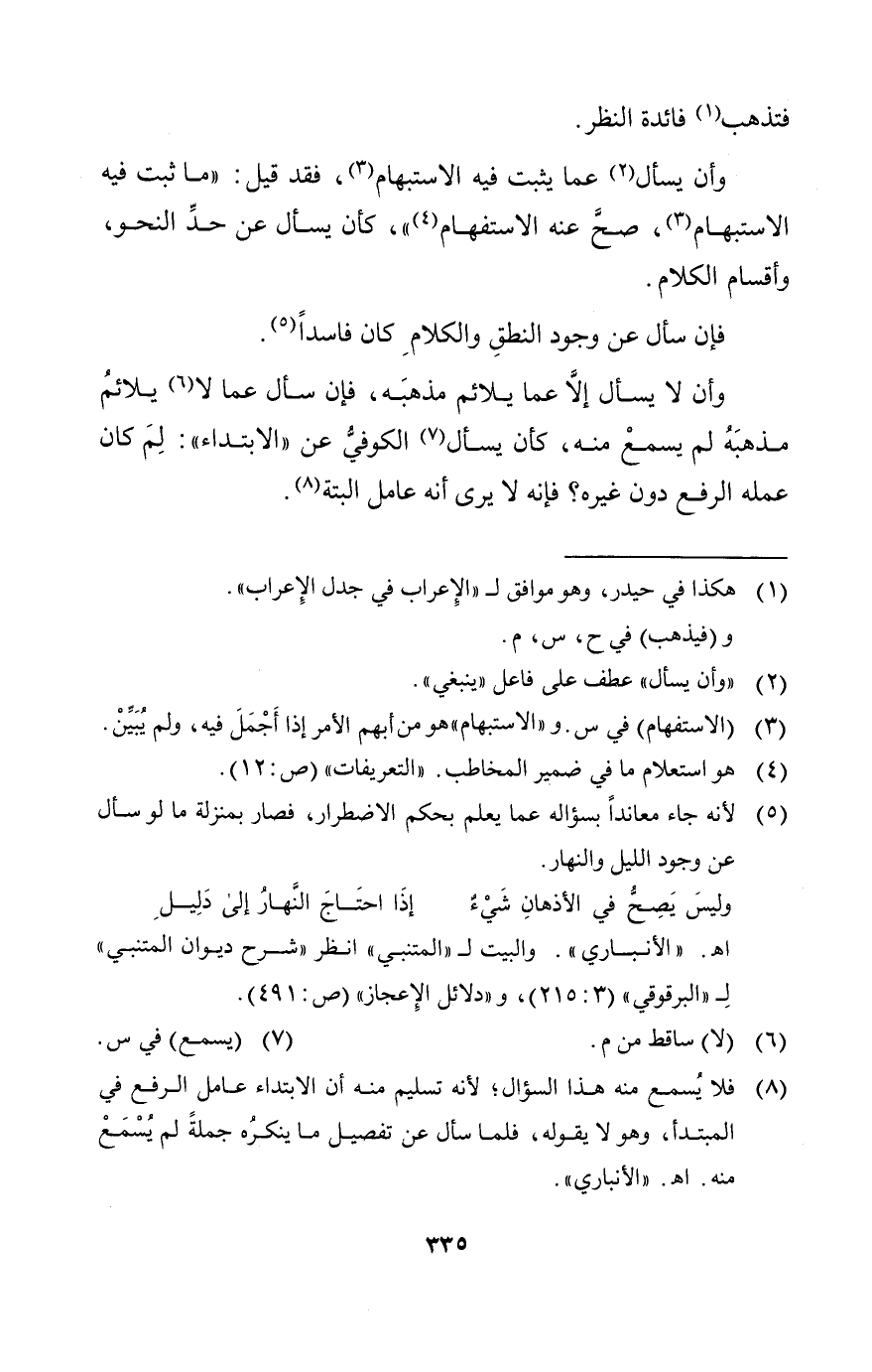 وأن لا يسأل إلا عن ما يلائم مذهبه فإن سأل عما لا يلائم مذهبه لم يسمع منه كأن يسأل الكوفي عن الابتداء لم كان عمله الرفع دون غيره؟ فإنه لايرى أنه عامل البتة.