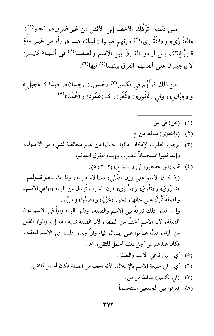 من ذلك تركك الأخف إلى الأثقل من غير ضرورة نحو: الفتوى والتقوى فإنهم قلبوا الياء هنا واومن غير علة قوية بل أرادوا الفرق بين الاسم والصفة في أشياء كثيرة لا يوجبون على أنفسهم الفرق بينهما فيها.