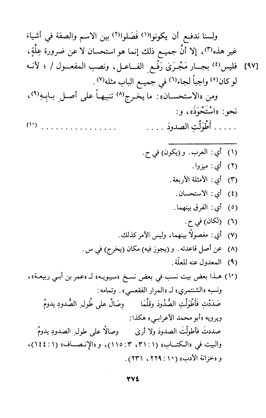 ولسنا ندفع أن يكونوا فصلوا بين الاسم والصفة في أشياء غير هذه إلا أن جميع ذلك إنما هو استحسان لا عن ضرورة علة فليس بجار مجرى رفع الفاعل ونصب المفعول لأنه لو كان واجبا لجاء في جميع الباب مثله.