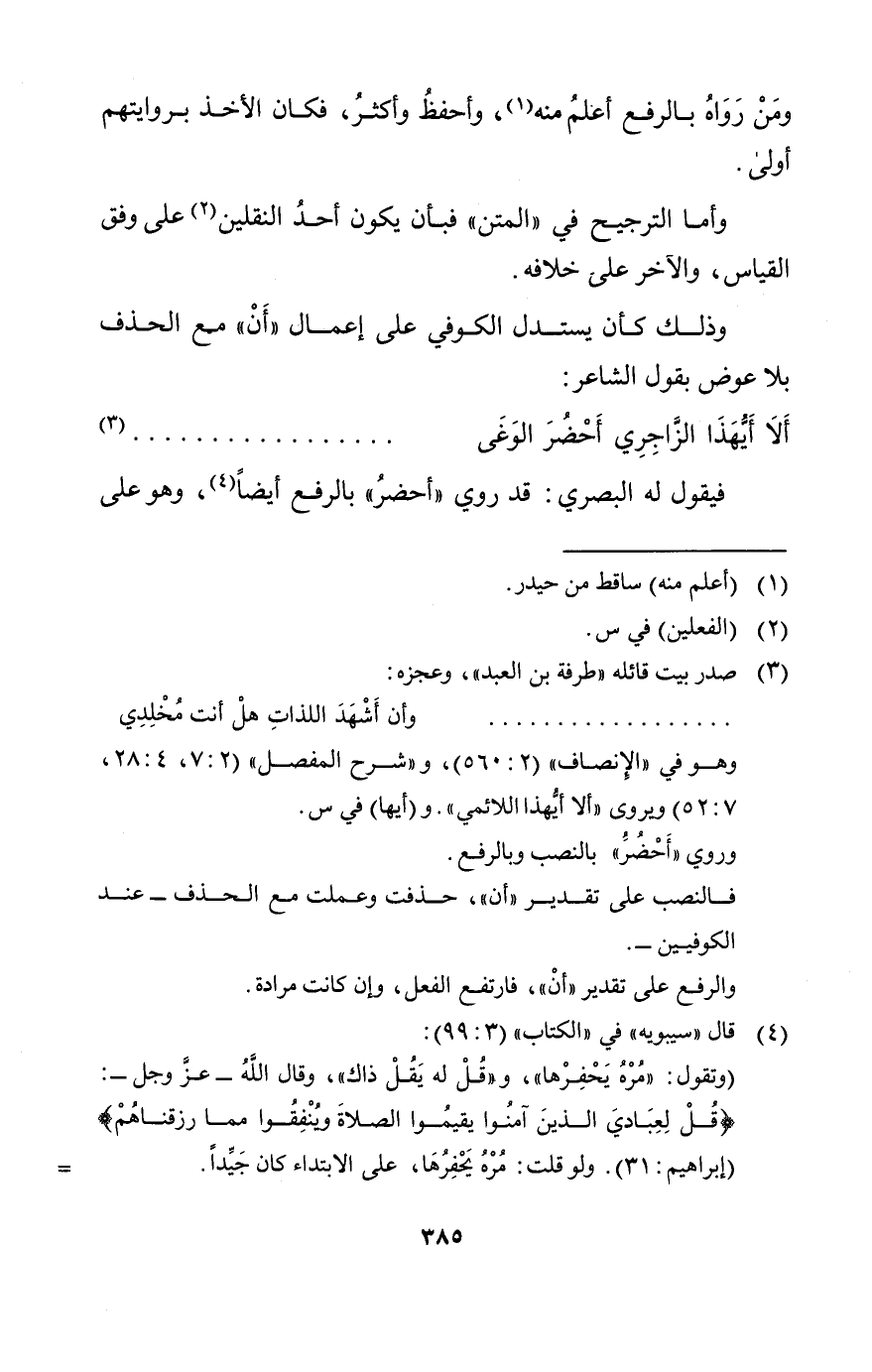 وأما الترجيح في المتن فبأن يكون أحد النقلين على وفق القياس والآخر على خلافه وذلك كأن يستدل الكوفي على إعمال (أن) مع الحذف بلا عوض بقول الشاعر: