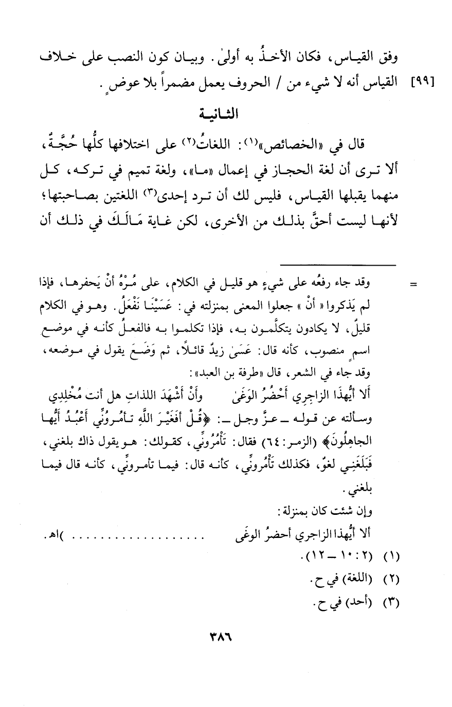 " اللغات على اختلافها حجة, ألا ترى أن لغة أهل الحجاز في إعمال (ما) ولغة بني تميم في تركه كل منهما يقبلها القياس فليس لك أن ترد إحدى اللغتين بصاحبتها لأنها ليست أحق بذلك من الأخرى لكن غاية ما لك في ذلك أن