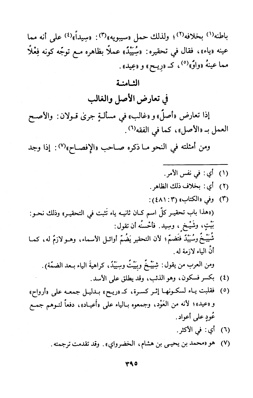 باطنه بخلافه ولذلك حمل سيبويه (سيدا) على أنه مما عينه ياء فقال في تحقيره (سييد) عملا بظاهره مع توجه كونه فعلا مما عينه واو كـ (ريح) و (عيد) ".