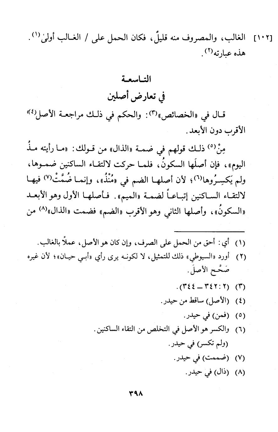 من ذلك قولهم في ضمة الذال من قولك: ما رأيته مذ اليوم فإن أصلها السكون فلما حركت لالتقاء الساكنين ضموها ولم يكسروها لأن أصلها الضم في منذ وإنما ضمت فيها لالتقاء الساكنين إتباعا لضمة الميم.
