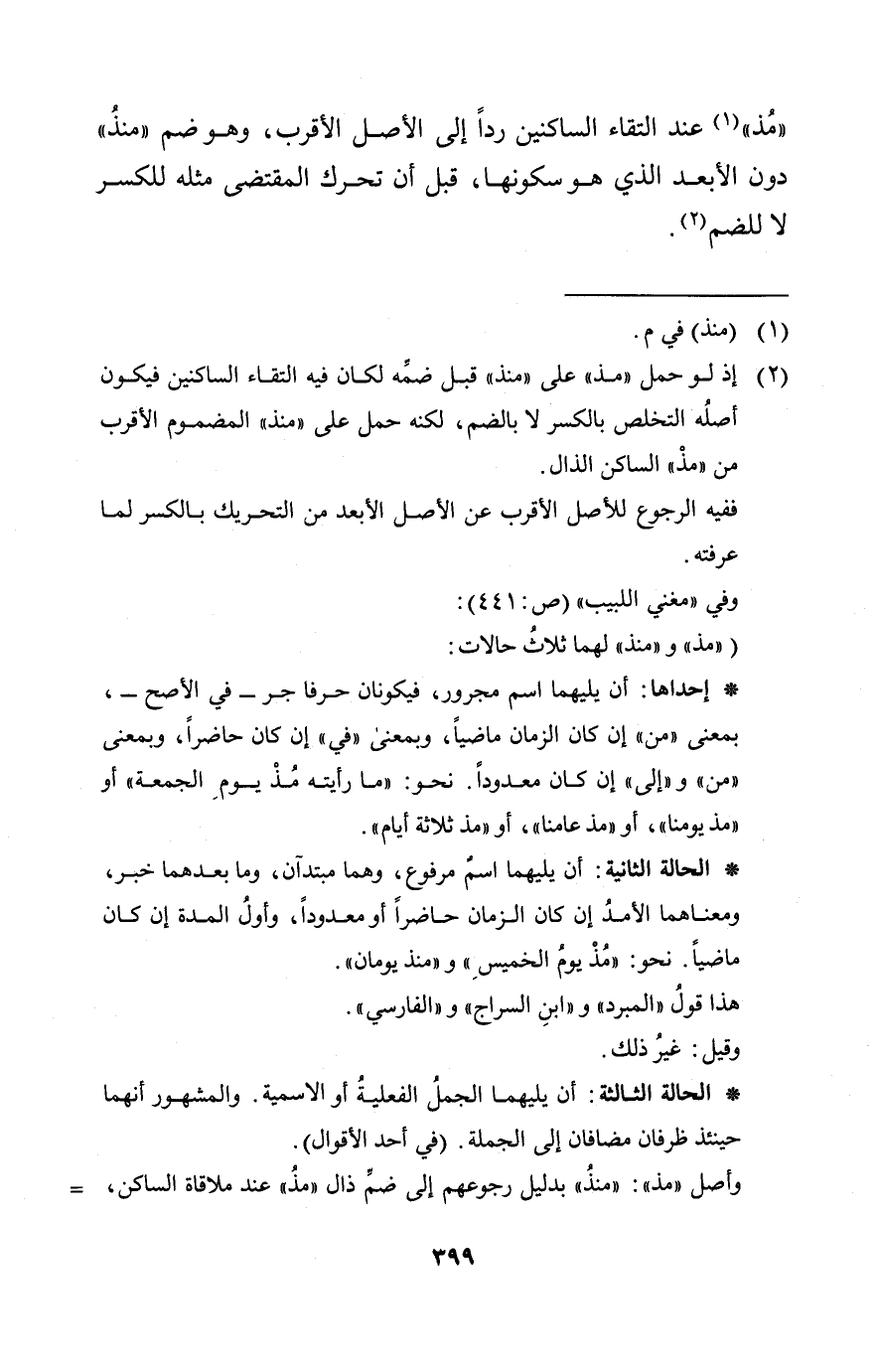 (مذ) عند التقاء الساكنين ردا إلى إلى الأصل الأقرب وهو ضم منذ دون الأبعد الذي هو سكونها قبل أن تحرك المقتضي مثله للكسر لا للضم.