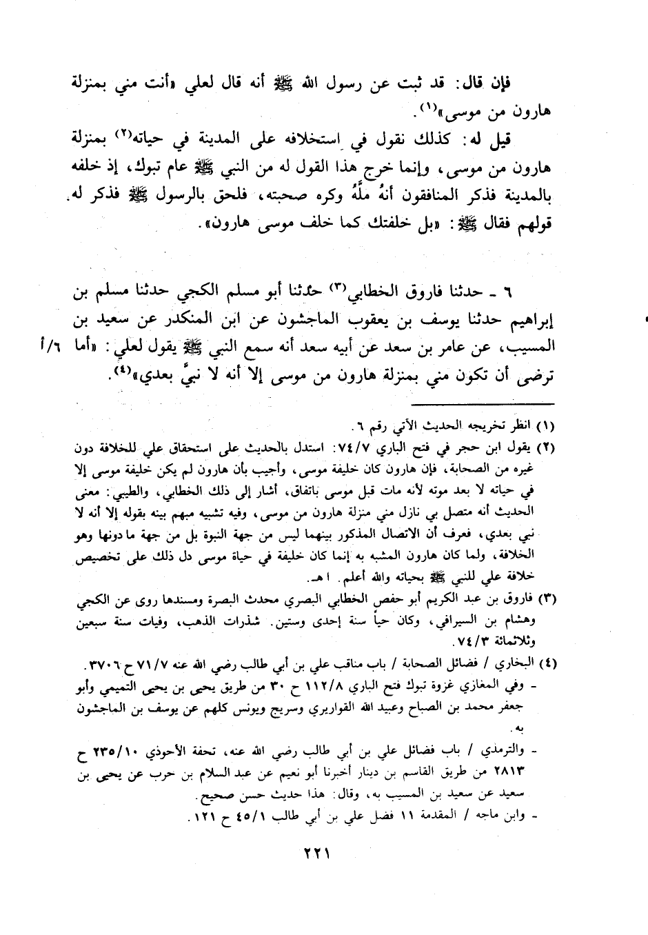 6 - حَدثنَا فاروق الْخطابِيّ حَدثنَا أَبُو مُسلم الْكَجِّي حَدثنَا مُسلم بن إِبْرَاهِيم حَدثنَا يُوسُف بن يَعْقُوب الْمَاجشون عَن ابْن الْمُنْكَدر عَن سعيد بن الْمسيب، عَن عَامر بن سعد عَن أَبِيه سعد أَنه سمع النَّبِي - صَلَّى اللَّهُ عَلَيْهِ وَسَلَّم َ - يَقُول لعَلي: " أما ترْضى أَن تكون مني بِمَنْزِلَة هَارُون بن مُوسَى إِلَّا أَنه لَا نَبِي بعدِي ".