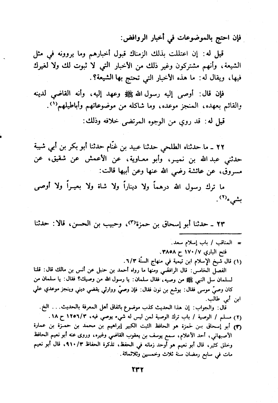 فَإِن قَالَ: أوصى إِلَيْهِ رَسُول الله - صَلَّى اللَّهُ عَلَيْهِ وَسَلَّم َ - وعهد إِلَيْهِ، وَأَنه القَاضِي لدينِهِ والقائم بعهده، الْمُنجز موعده، وَمَا شاكله من موضوعاتهم وأباطيلهم.