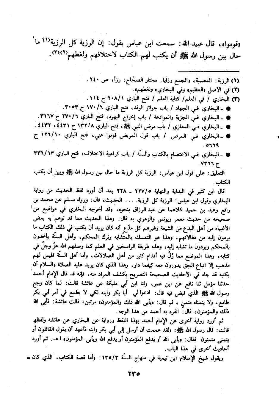 " قومُوا "، قَالَ عبيد الله: سَمِعت ابْن عَبَّاس يَقُول: إِن الرزية كل الرزية مَا حَال بَين رَسُول الله - صَلَّى اللَّهُ عَلَيْهِ وَسَلَّم َ - أَن يكْتب لَهُم الْكتاب لاختلافهم ولغطهم.
