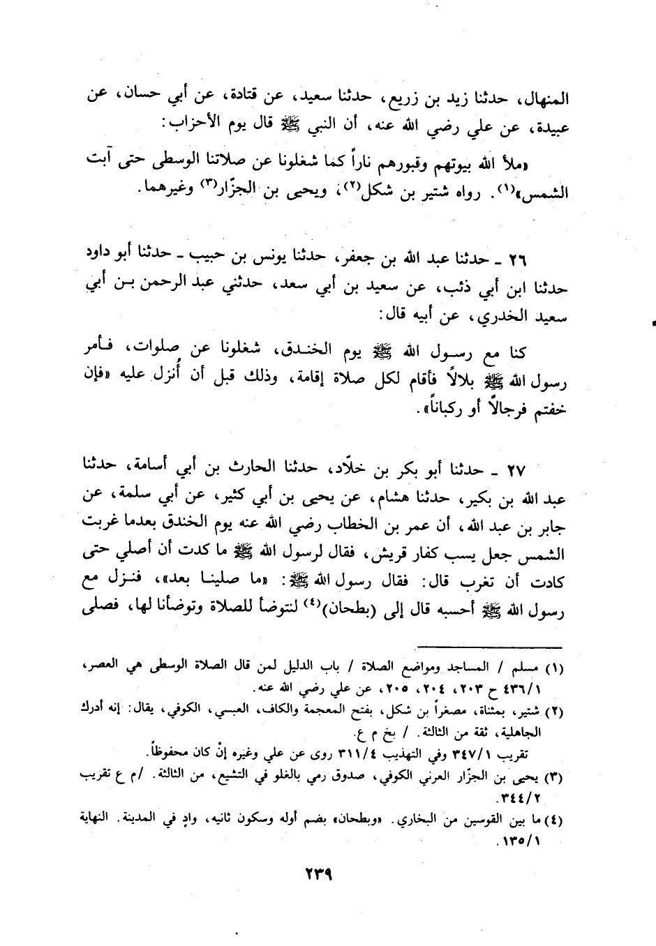 الْمنْهَال، حَدثنَا زيد بن زُرَيْع، حَدثنَا سعيد، عَن قَتَادَة، عَن أبي حسان، عَن عُبَيْدَة، عَن عَليّ رَضِي الله عَنهُ، أَن النَّبِي - صَلَّى اللَّهُ عَلَيْهِ وَسَلَّم َ - قَالَ يَوْم الْأَحْزَاب: " مَلأ الله بُيُوتهم وقبورهم نَارا كَمَا شغلونا عَن صَلَاتنَا الْوُسْطَى حَتَّى آبت الشَّمْس ". رَوَاهُ شُتَيْر بن شكل، وَيحيى بن الجزار وَغَيرهمَا.