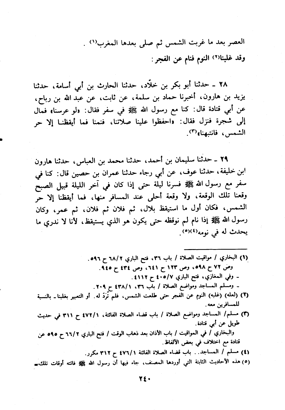 28 - حَدثنَا أَبُو بكر بن خَلاد، حَدثنَا الْحَارِث بن أبي أُسَامَة، حَدثنَا يزِيد بن هَارُون، أخبرنَا حَمَّاد بن سَلمَة، عَن ثَابت، عَن عبد الله بن رَبَاح، عَن أبي قَتَادَة قَالَ: كُنَّا مَعَ رَسُول الله - صَلَّى اللَّهُ عَلَيْهِ وَسَلَّم َ - فِي سفر فَقَالَ: " لَو عرسنا " فَمَال إِلَى شَجَرَة فَنزل فَقَالَ: " احْفَظُوا علينا صَلَاتنَا، فنمنا فَمَا أيقظنا إِلَّا حر الشَّمْس، فانتبهنا ".