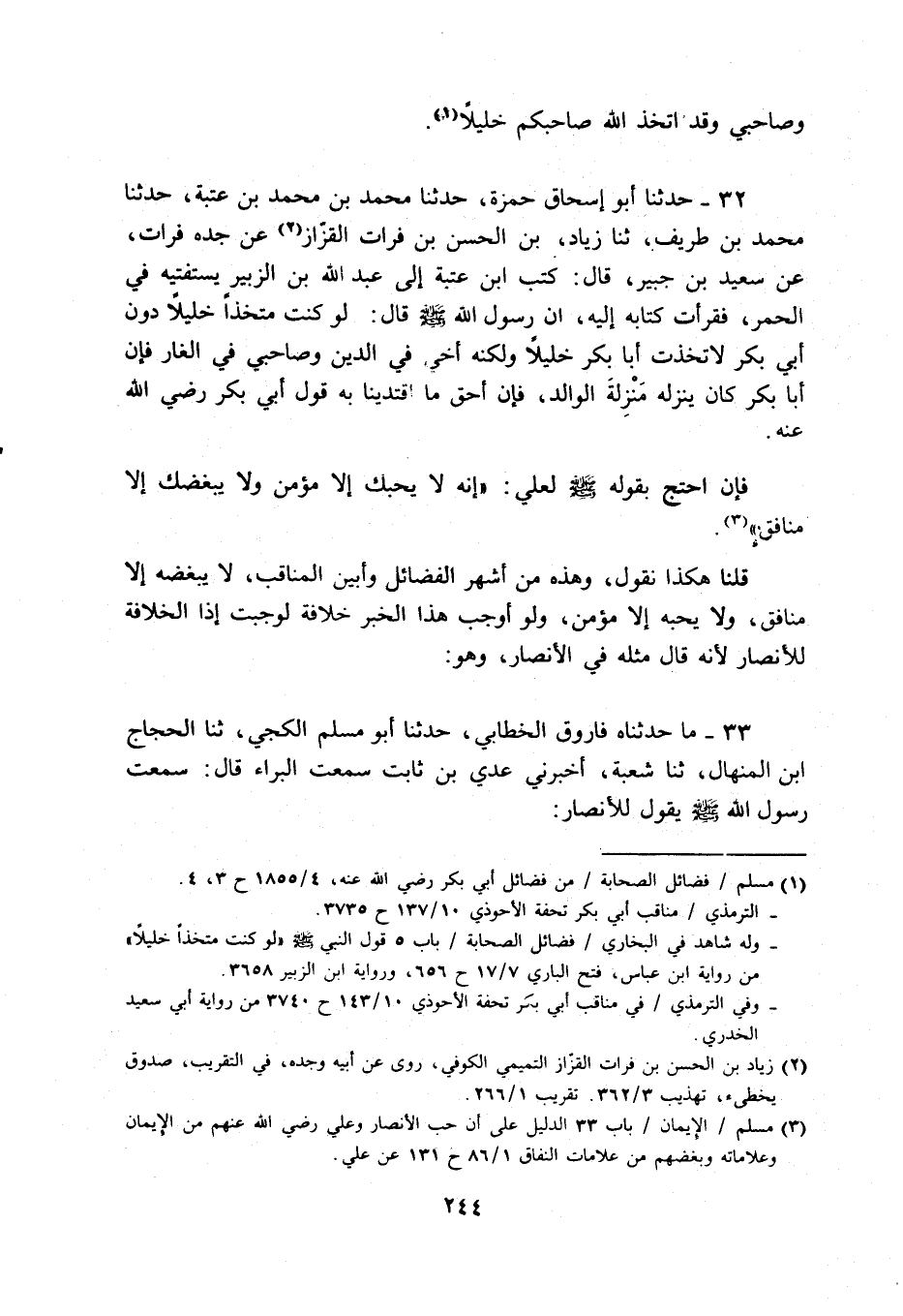 32 - حَدثنَا أَبُو إِسْحَاق حَمْزَة، حَدثنَا مُحَمَّد بن مُحَمَّد بن عتبَة، حَدثنَا مُحَمَّد بن طريف، ثَنَا زِيَاد، بن الْحسن بن فرات الْقَزاز عَن جده فرات، عَن سعيد بن جُبَير، قَالَ: كتب ابْن عتبَة إِلَى عبد الله بن الزبير يستفتيه فِي الْحمر، فَقَرَأت كِتَابه إِلَيْهِ، أَن رَسُول الله - صَلَّى اللَّهُ عَلَيْهِ وَسَلَّم َ - قَالَ: لَو كنت متخذاً خَلِيلًا دون أبي بكر لاتخذت أَبَا بكر خَلِيلًا وَلكنه أخي فِي الدّين وصاحبي فِي الْغَار فَإِن أَبَا بكر كَانَ ينزله منزلَة الْوَالِد، فَإِن أَحَق مَا اقتدينا بِهِ قَول أبي بكر رَضِي الله عَنهُ.