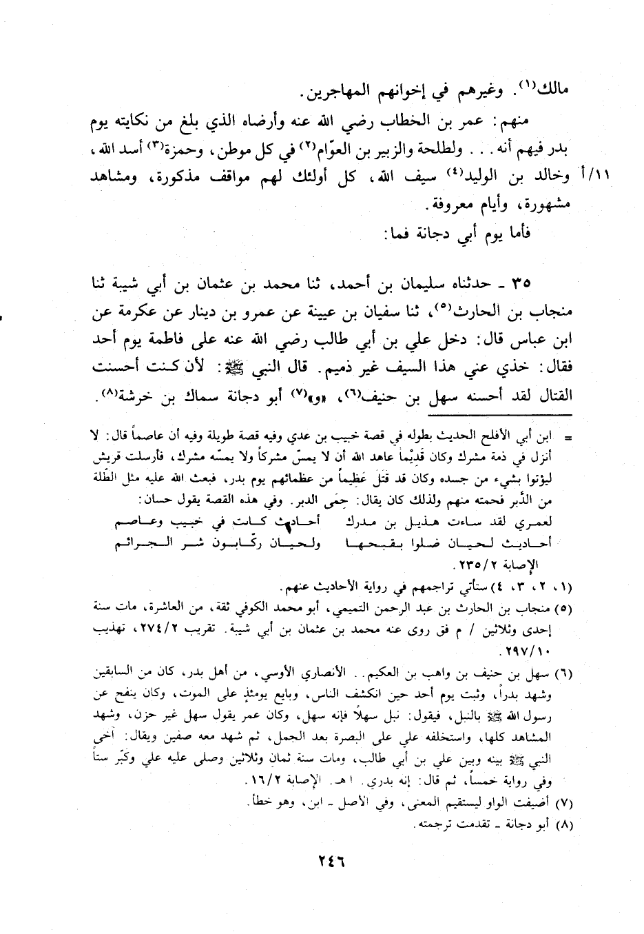 35 - حدّثنَاهُ سُلَيْمَان بن أَحْمد، ثَنَا مُحَمَّد بن عُثْمَان بن أبي شيبَة ثَنَا منْجَاب بن الْحَارِث، ثَنَا سُفْيَان بن عُيَيْنَة عَن عَمْرو بن دِينَار عَن عِكْرِمَة عَن ابْن عَبَّاس قَالَ: دخل عَليّ بن أبي طَالب رَضِي الله عَنهُ على فَاطِمَة يَوْم أحد فَقَالَ: خذي عني هَذَا السَّيْف غير ذميم. قَالَ النَّبِي - صَلَّى اللَّهُ عَلَيْهِ وَسَلَّم َ -: لِأَن كنت أَحْسَنت الْقِتَال لقد أحْسنه سهل بن حنيف، " و " أَبُو دُجَانَة سماك بن خَرشَة.