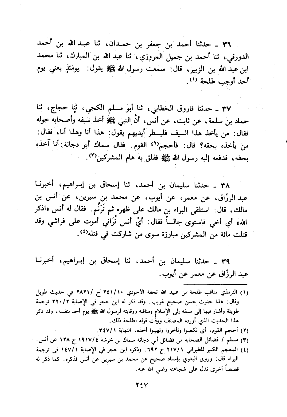 36 - حَدثنَا أَحْمد بن جَعْفَر بن حمدَان، ثَنَا عبد الله بن أَحْمد الدَّوْرَقِي، ثَنَا أَحْمد بن جميل الْمروزِي، ثَنَا عبد الله بن الْمُبَارك، ثَنَا مُحَمَّد ابْن عبد الله بن الزبير، قَالَ: سَمِعت رَسُول الله - صَلَّى اللَّهُ عَلَيْهِ وَسَلَّم َ - يَقُول: يَوْمئِذٍ يَعْنِي يَوْم أحد أوجب طَلْحَة.