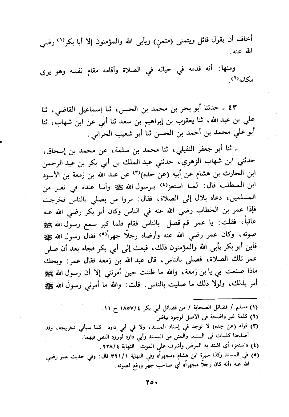 - ثَنَا أَبُو جَعْفَر النُّفَيْلِي، ثَنَا مُحَمَّد بن سَلمَة، عَن مُحَمَّد بن إِسْحَاق، حَدثنِي ابْن شهَاب الزُّهْرِيّ، حَدثنِي عبد الْملك بن أبي بكر بن عبد الرَّحْمَن ابْن الْحَارِث بن هِشَام عَن أَبِيه (عَن جده) عَن عبد الله بن زَمعَة بن الْأسود ابْن الْمطلب قَالَ: لما اسْتعزَّ برَسُول الله - صَلَّى اللَّهُ عَلَيْهِ وَسَلَّم َ - وَأَنا عِنْده فِي نفر من الْمُسلمين، دَعَاهُ بِلَال إِلَى الصَّلَاة، فَقَالَ: مروا من يُصَلِّي بِالنَّاسِ فَخرجت فَإِذا عمر بن الْخطاب رَضِي الله عَنهُ فِي النَّاس وَكَانَ أَبُو بكر رَضِي الله عَنهُ غَائِبا، فَقلت: يَا عمر قُم فصل بِالنَّاسِ فَقَامَ فَلَمَّا كبر سمع رَسُول الله - صَلَّى اللَّهُ عَلَيْهِ وَسَلَّم َ - صَوته، وَكَانَ عمر رَضِي الله عَنهُ وأرضاه رجلا جَهرا فَقَالَ رَسُول الله - صَلَّى اللَّهُ عَلَيْهِ وَسَلَّم َ - فَأَيْنَ أَبُو بكر يَأْبَى الله وَالْمُؤمنِينَ ذَلِك، فَبعث إِلَى أبي بكر فجَاء بعد أَن صلى عمر تِلْكَ الصَّلَاة، فصلى النَّاس، قَالَ عبد الله بن زَمعَة فَقَالَ عمر: وَيحك مَاذَا صنعت بِي يَا بن زَمعَة، وَالله مَا ظَنَنْت حِين أَمرتنِي إِلَّا أَن رَسُول الله - صَلَّى اللَّهُ عَلَيْهِ وَسَلَّم َ - أَمر بذلك، وَلَوْلَا ذَلِك مَا صليت بِالنَّاسِ. قلت: وَالله مَا أَمرنِي رَسُول الله - صَلَّى اللَّهُ عَلَيْهِ وَسَلَّم َ -
