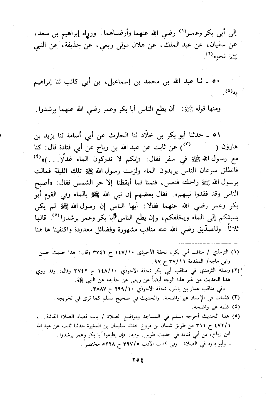 51 - حَدثنَا أَبُو بكر بن خَلاد ثَنَا الْحَارِث عَن أبي أُسَامَة ثَنَا يزِيد بن هَارُون عَن ثَابت عَن عبد الله بن رَبَاح عَن أبي قَتَادَة قَالَ: كُنَّا مَعَ رَسُول الله - صَلَّى اللَّهُ عَلَيْهِ وَسَلَّم َ - فِي سفر فَقَالَ: " إِنَّكُم لَا تدركون المَاء غَدا " فَانْطَلق سرعَان النَّاس يُرِيدُونَ المَاء ولزمت رَسُول الله - صَلَّى اللَّهُ عَلَيْهِ وَسَلَّم َ - تِلْكَ اللَّيْلَة فمالت برَسُول الله - صَلَّى اللَّهُ عَلَيْهِ وَسَلَّم َ - رَاحِلَته فنعس، فنمنا فَمَا أيقظنا إِلَّا حر الشَّمْس فَقَالَ: " أصبح النَّاس وَقد فقدوا نَبِيّهم ". فَقَالَ بَعضهم إِن نَبِي الله - صَلَّى اللَّهُ عَلَيْهِ وَسَلَّم َ - بِالْمَاءِ وَفِي الْقَوْم أَبُو بكر وَعمر رَضِي الله عَنْهُمَا فَقَالَا: أَيهَا النَّاس إِن رَسُول الله - صَلَّى اللَّهُ عَلَيْهِ وَسَلَّم َ - لم يكن يسبقكم إِلَى المَاء ويخلفكم، وَإِن يطع النَّاس أَبَا بكر وَعمر يرشدوا. قَالَهَا ثَلَاثًا. وللصديق رَضِي الله عَنهُ مَنَاقِب مَشْهُورَة وفضائل مَعْدُودَة واكتفينا هَا هُنَا