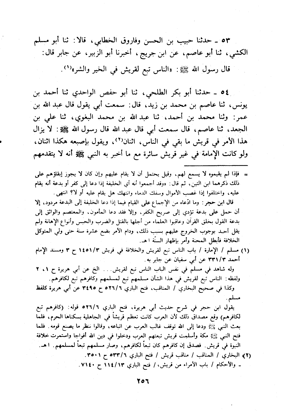 54 - حَدثنَا أَبُو بكر الطلحي، ثَنَا أَبُو حَفْص الواحدي ثَنَا أَحْمد بن يُونُس، ثَنَا عَاصِم بن مُحَمَّد بن زيد، قَالَ: سَمِعت أبي يَقُول قَالَ عبد الله بن عمر: وثنا مُحَمَّد بن أَحْمد، ثَنَا عبد الله بن مُحَمَّد الْبَغَوِيّ، ثَنَا عَليّ بن الْجَعْد، ثَنَا عَاصِم، قَالَ سَمِعت أبي قَالَ عبد الله قَالَ رَسُول الله - صَلَّى اللَّهُ عَلَيْهِ وَسَلَّم َ -: لَا يزَال هَذَا الْأَمر فِي قُرَيْش مَا بَقِي فِي النَّاس، اثْنَان، وَيَقُول بإصبعه هَكَذَا اثْنَان، وَلَو كَانَ الْإِمَامَة فِي غير قُرَيْش سائرةً مَعَ مَا أخبر النَّبِي - صَلَّى اللَّهُ عَلَيْهِ وَسَلَّم َ - أَنه لَا يتقدمهم