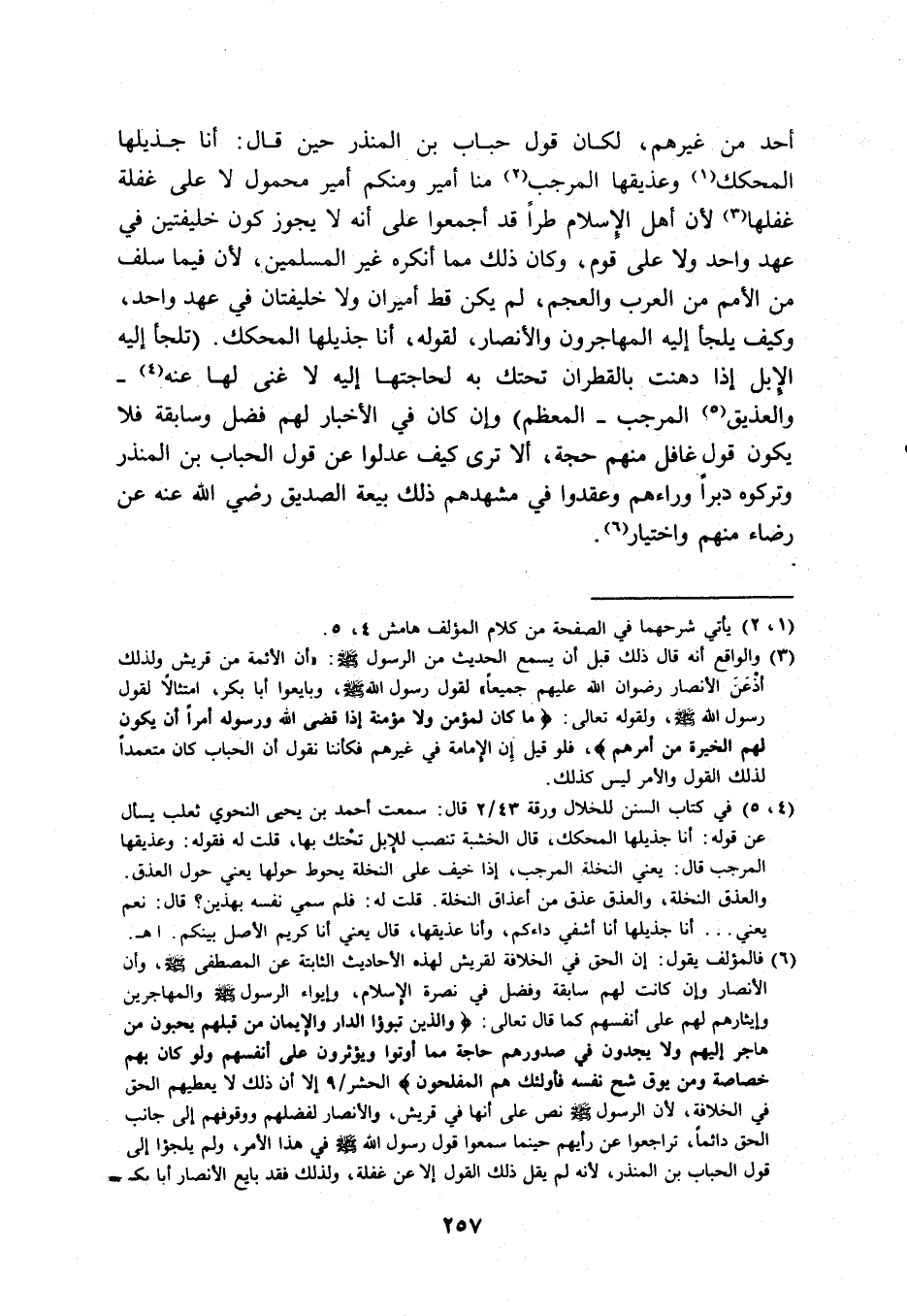 أحد من غَيرهم، لَكَانَ قَول حباب بن الْمُنْذر حِين قَالَ: أَنا جذيلها المحكك وعذيقها المرجب منا أَمِير ومنكم أَمِير مَحْمُول لَا على غَفلَة غفلها لِأَن أهل الْإِسْلَام طَرَأَ قد أَجمعُوا على أَنه لَا يجوز كَون خليفتين فِي عهد وَاحِد وَلَا على قوم، وَكَانَ ذَلِك مِمَّا أنكرهُ غير الْمُسلمين، لِأَن فِيمَا سلف من الْأُمَم من الْعَرَب والعجم، لم يكن قطّ أميران وَلَا خليفتان فِي عهد وَاحِد، وَكَيف يلجأ إِلَيْهِ الْمُهَاجِرُونَ وَالْأَنْصَار، لقَوْله، أَنا جذيلها المحكك. (تلجأ إِلَيْهِ الْإِبِل إِذا دهنت بالقطران تَحْتك بِهِ لحاجتها إِلَيْهِ لَا غنى لَهَا عَنهُ - والعذيق المرجب - الْمُعظم) وَإِن كَانَ فِي الْأَخْبَار لَهُم فضل وسابقة فَلَا يكون قَول غافل مِنْهُم حجَّة، أَلا ترى كَيفَ عدلوا عَن قَول الْحباب بن الْمُنْذر وتركوه دبراً وَرَاءَهُمْ وعقدوا فِي مشهدهم ذَلِك بيعَة الصّديق رَضِي الله عَنهُ عَن رِضَاء مِنْهُم وَاخْتِيَار.