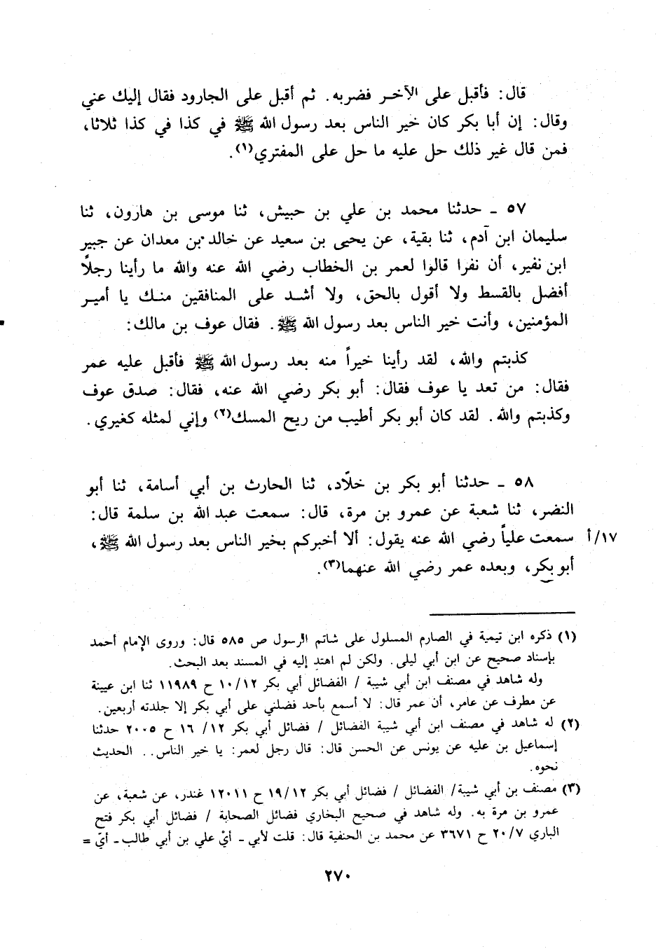 58 - حَدثنَا أَبُو بكر بن خَلاد، ثَنَا الْحَارِث بن أبي أُسَامَة، ثَنَا أَبُو النَّضر، ثَنَا شُعْبَة عَن عَمْرو بن مرّة، قَالَ: سَمِعت عبد الله بن سَلمَة قَالَ: سَمِعت عليا رَضِي الله عَنهُ يَقُول: أَلا أخْبركُم بِخَير النَّاس بعد رَسُول الله - صَلَّى اللَّهُ عَلَيْهِ وَسَلَّم َ -، أَبُو بكر، وَبعده عمر رَضِي الله عَنْهُمَا.