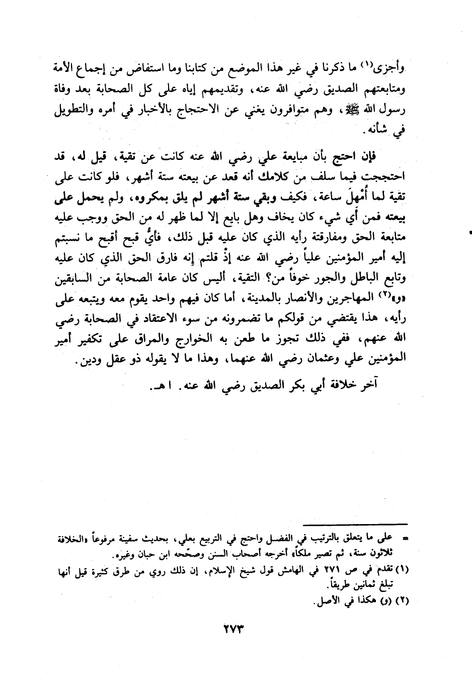 فَإِن احْتج بِأَن مبايعة عَليّ رَضِي الله عَنهُ كَانَت عَن تقية، قيل لَهُ، قد احتججت فِيمَا سلف من كلامك أَنه قعد عَن بيعَته سِتَّة أشهر، فَلَو كَانَت على تقية لما أمْهل سَاعَة، فَكيف وَبَقِي سِتَّة أشهر لم يلق بمكروه، وَلم يحمل على بيعَته فَمن أَي شَيْء كَانَ يخَاف وَهل بَايع إِلَّا لما ظهر لَهُ من الْحق وَوَجَب عَلَيْهِ مُتَابعَة الْحق ومفارقته رَأْيه الَّذِي كَانَ عَلَيْهِ قبل ذَلِك، فَأَي قبح أقبح مَا نسبتم إِلَيْهِ أَمِير الْمُؤمنِينَ عليا رَضِي الله عَنهُ إِذْ قُلْتُمْ إِنَّه فَارق الْحق الَّذِي كَانَ عَلَيْهِ وتابع الْبَاطِل والجور خوفًا من؟ التقية، أَلَيْسَ كَانَ عَامَّة الصَّحَابَة من السَّابِقين " و " الْمُهَاجِرين وَالْأَنْصَار بِالْمَدِينَةِ، أما كَانَ فيهم وَاحِد يقوم مَعَه ويتبعه على رَأْيه، هَذَا يَقْتَضِي من قَوْلكُم مَا تضمرونه من سوء الِاعْتِقَاد فِي الصَّحَابَة رَضِي الله عَنْهُم، فَفِي ذَلِك تجوز مَا طعن بِهِ الْخَوَارِج والمراق على تَكْفِير أَمِير الْمُؤمنِينَ عَليّ وَعُثْمَان رَضِي الله عَنْهُمَا، وَهَذَا مَا لَا يَقُوله ذُو عقل وَدين.