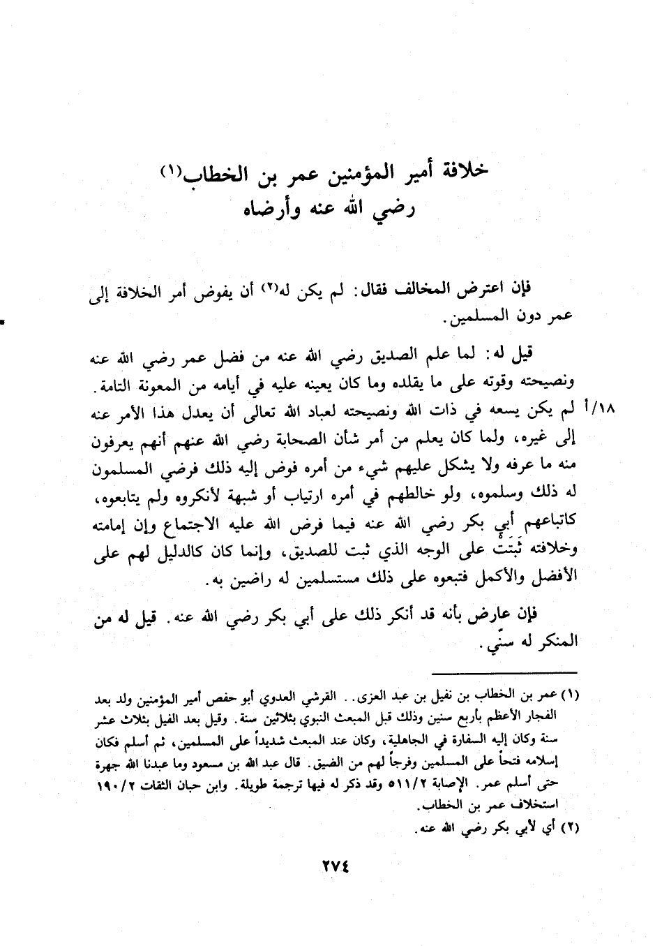 قيل لَهُ: لما علم الصّديق رَضِي الله عَنهُ من فضل عمر رَضِي الله عَنهُ ونصيحته وقوته على مَا يقلده وَمَا كَانَ يُعينهُ عَلَيْهِ فِي أَيَّامه من المعونة التَّامَّة. لم يكن يَسعهُ فِي ذَات الله ونصيحته لعباد الله تَعَالَى أَن يعدل هَذَا الْأَمر عَنهُ إِلَى غَيره، وَلما كَانَ يعلم من أَمر شَأْن الصَّحَابَة رَضِي الله عَنْهُم أَنهم يعْرفُونَ مِنْهُ مَا عرف وَلَا يشكل عَلَيْهِم شَيْء من أمره فوض إِلَيْهِ ذَلِك فَرضِي الْمُسلمُونَ لَهُ ذَلِك وسلموه، وَلَو خالطهم فِي أمره ارتياب أَو شُبْهَة لأنكروه وَلم يتابعوه، كاتباعهم أبي بكر رَضِي الله عَنهُ فِيمَا فرض عَلَيْهِ الِاجْتِمَاع وَإِن إِمَامَته وخلافته ثبتَتْ على الْوَجْه الَّذِي ثَبت للصديق، وَإِنَّمَا كَانَ كالدليل لَهُم على الْأَفْضَل والأكمل فتبعوه على ذَلِك مستسلمين لَهُ راضين بِهِ.