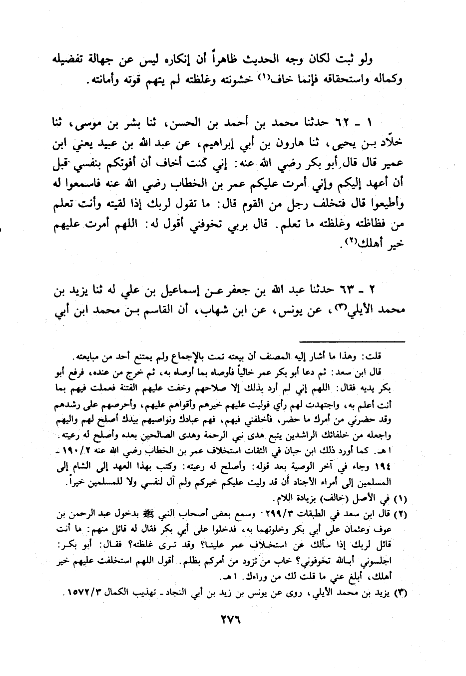 1 - 62 حَدثنَا مُحَمَّد بن أَحْمد بن الْحسن، ثَنَا بشر بن مُوسَى، ثَنَا خَلاد بن يحيى، ثَنَا هَارُون بن أبي إِبْرَاهِيم، عَن عبد الله بن عبيد يَعْنِي ابْن عُمَيْر قَالَ قَالَ أَبُو بكر رَضِي الله عَنهُ: إِنِّي كنت أَخَاف أَن أفوتكم بنفسي قبل أَن أَعهد إِلَيْكُم وَإِنِّي أمرت عَلَيْكُم عمر بن الْخطاب رَضِي الله عَنهُ فَاسْمَعُوا لَهُ وَأَطيعُوا قَالَ فَتخلف رجل من الْقَوْم قَالَ: مَا تَقول لِرَبِّك إِذا لَقيته وَأَنت تعلم من فظاظته وغلظته مَا تعلم. قَالَ بربي تخوفني أَقُول لَهُ: اللَّهُمَّ أمرت عَلَيْهِم خير أهلك.