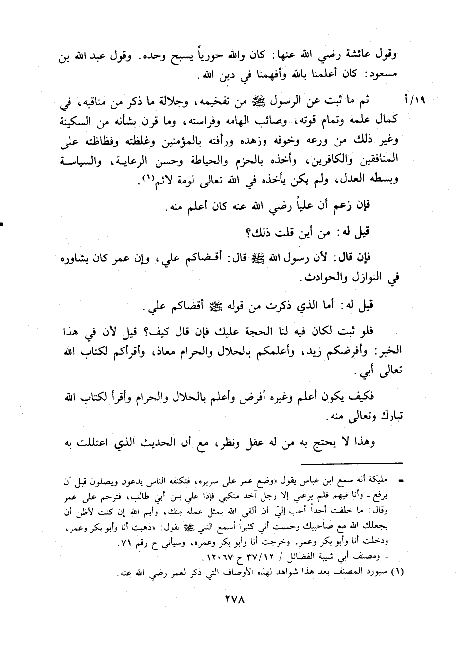 ثمَّ مَا ثَبت عَن الرَّسُول - صَلَّى اللَّهُ عَلَيْهِ وَسَلَّم َ - من تفخيمه، وجلالة مَا ذكر من مناقبه، فِي كَمَال علمه وَتَمام قوته، وصائب الهامه وفراسته، وَمَا قرن بِشَأْنِهِ من السكينَة وَغير ذَلِك من ورعه وخوفه وزهده ورأفته بِالْمُؤْمِنِينَ وغلظته وفظاظته على الْمُنَافِقين والكافرين، وَأَخذه بالحزم والحياطة وَحسن الرِّعَايَة، والسياسة وَبسطه الْعدْل، وَلم يكن يَأْخُذهُ فِي الله تَعَالَى لومة لائم.